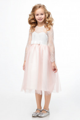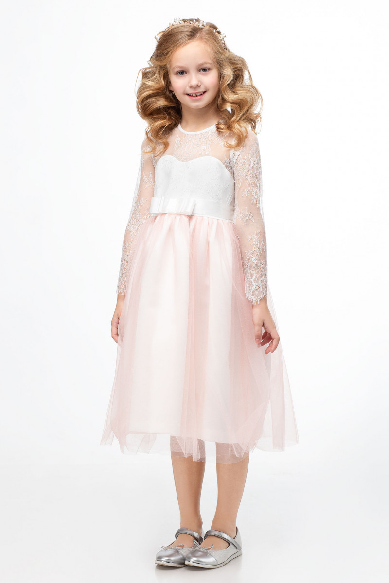 Очень нарядное платье для девочки. Платье выполнено на сочетании тонкого французского кружева и легкого воздушного фатина. Платье отрезное по талии, нижняя часть платья пышная юбка со сборкой. Верхняя часть кружевная. Платье дополнено атласной лентой , которая позволяет регулировать приталенность. По переду на талии платье украшает бант. Очень нежное и нарядное платье идеальный вариант для торжественных случаев.
