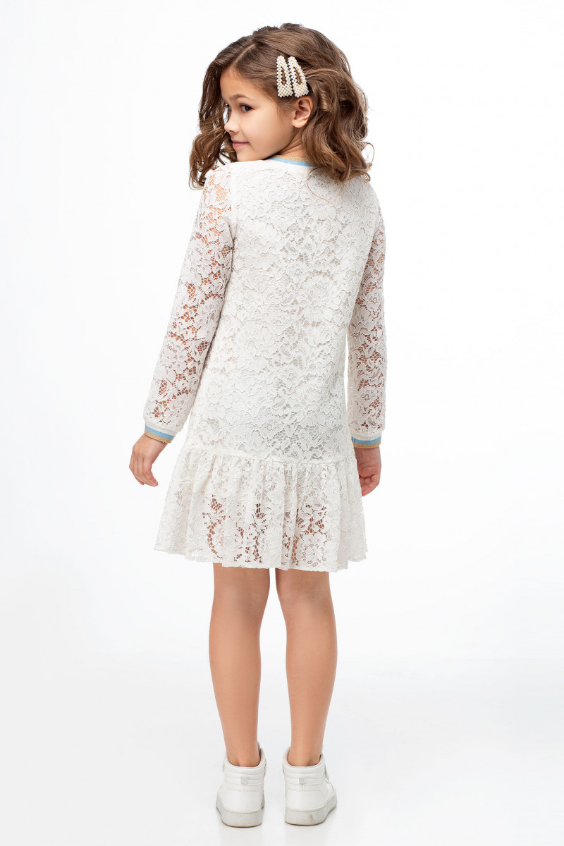 Нарядное платье для девочки выполненое из хлопкового кружева на трикотажной хлопковой подкладки. Платья расширенного силуэта. с круглым вырезом горловины, с длинными рукавами. По низу платья рюша. Низ рукавов и горловина обработана изящными довязами. Отличный стильный вариант для торжественных случаев.