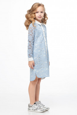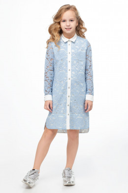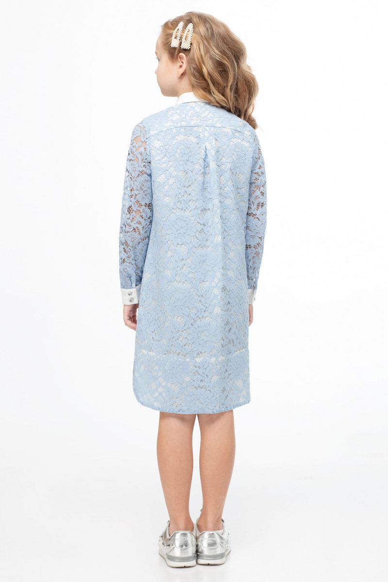 Стильное модное "платье-рубашка" для девочки из хлопкового кружева. Платье прямого силуэта, с длинными рукавами на притачной манжете, с воротником, с глубокой складкой по спинки. Спинка чуть удлиненная. Платье с центральной сквозной застежкой по переду на петли и пуговицы. . Очень стильное и модное платье для современной девочки.