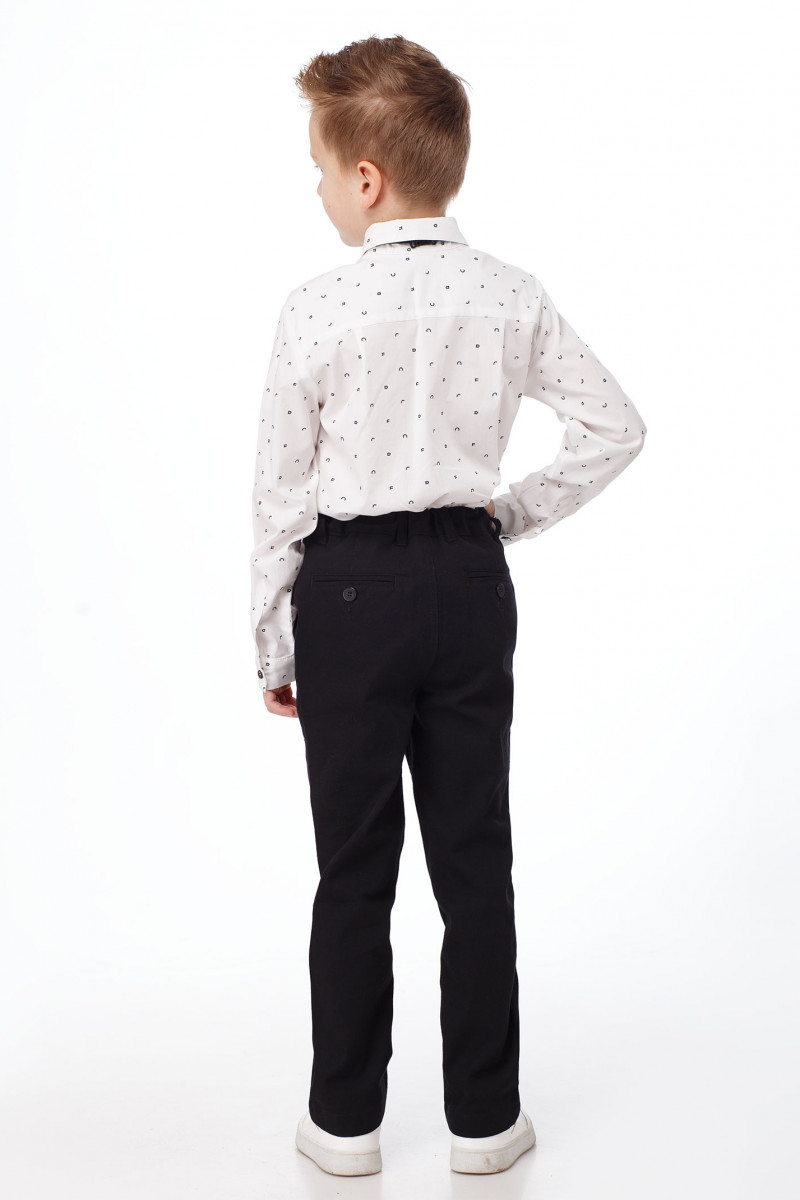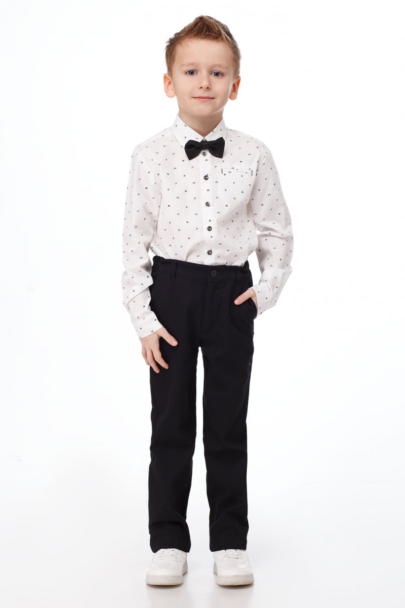 Сорочка для мальчика из хлопковой ткани в мелкий рисунок. Сорочка прямого силуэта, с центральной застежкой на петли и пуговицы и одну петлю и пуговицу на воротнике. На левой детали переда карман в рамку. Спинка с горизонтальной кокеткой и двумя небольшими складочками. Рукава рубашечные одношовные с притачными манжетами, застегивающимися на петлю и пуговицу. Разрезы рукавов обработаны английской планкой. Воротник сорочечный. Сорочка дополнена съёмной бабочкой на резинке.