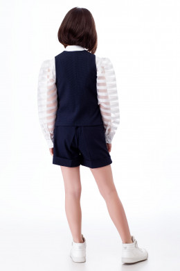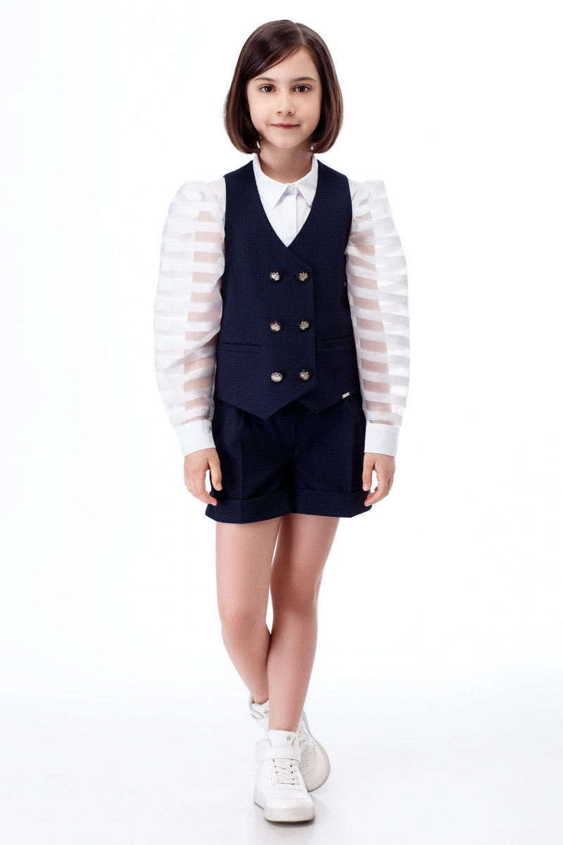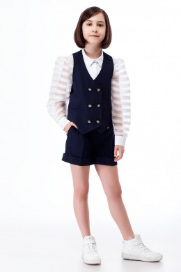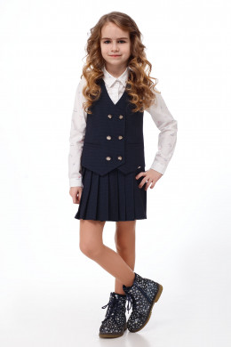 Жилет для девочки из поливискозной ткани с рисунком в мелкую клеточку. Жилет полуприлегающего силуэта с двубортной застежкой на петли и пуговицы, с V-образным вырезом горловины.
