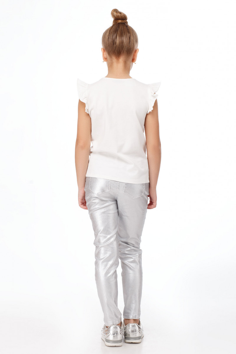 Стильный джемпер для девочки из хлопковой ткани. Джемпер полуприлегающего силуэта, с круглым вырезом горловины с декоративными рюшами по пройме. По переду нанесена декоративная печать. Отличный вариант для летних дней.