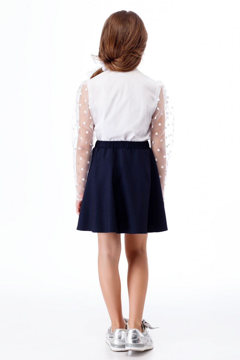 Нарядная блузка из хлопковой ткани с объёмными рукавами из прозрачной сетки с рисунком в горошек. Блузка полуприлегающего силуэта, застежка на потайные петли и пуговицы. Воротник стойка, по горловине объёмный декоративный бант. Такая блузка станет отличным вариантом для торжественных случаев.