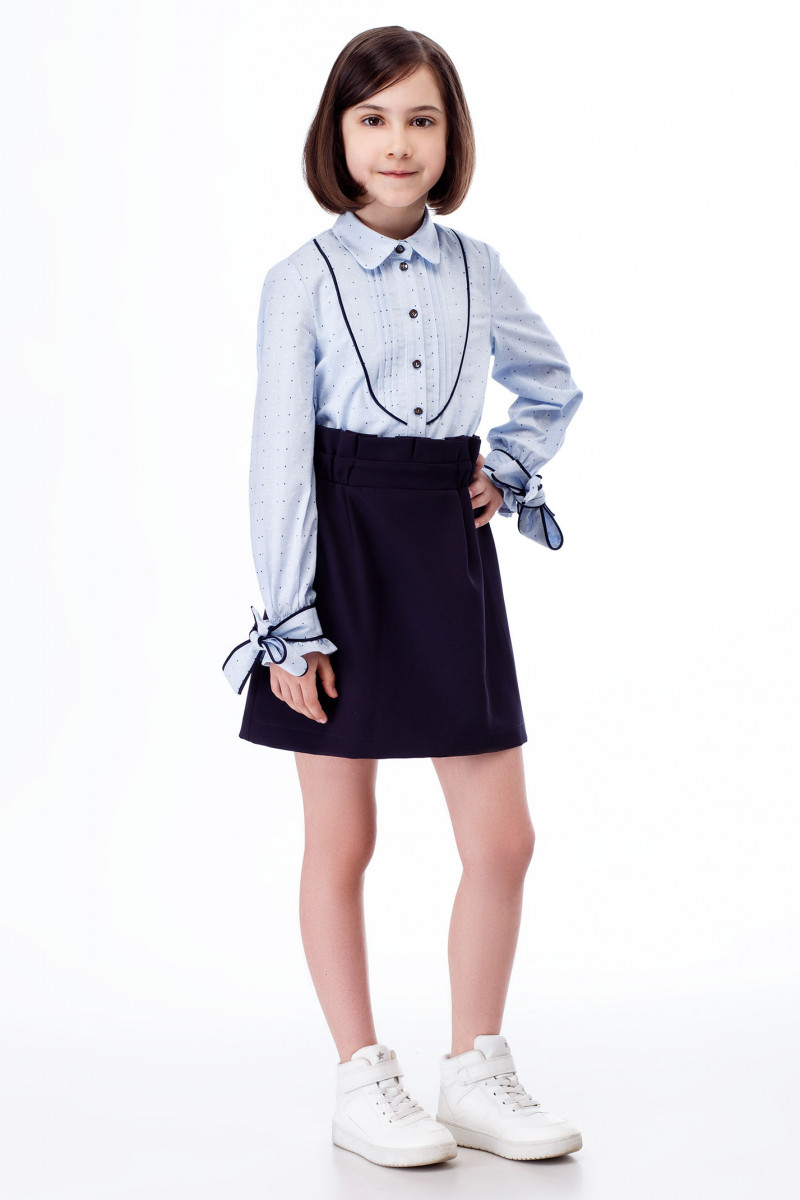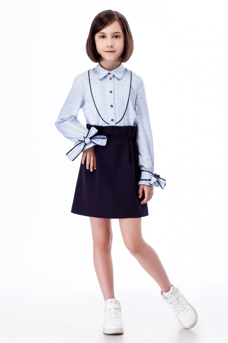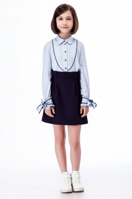 Школьное платье для девочки.Платье имитирует блузку с юбкой. Верх платья - блузка, с центральной застежкой на перли и пуговицы, с воротником, по переду декоративный кант и складочки. Рукава длинные, низ рукавов на резинке. По низу рукав декорирован бантиками. Низ платья - юбка, прямая, на резинке с декоративными складками по поясу. Низ платья на вискозной подкладки. Такое платье отличный вариант для школьных дней.