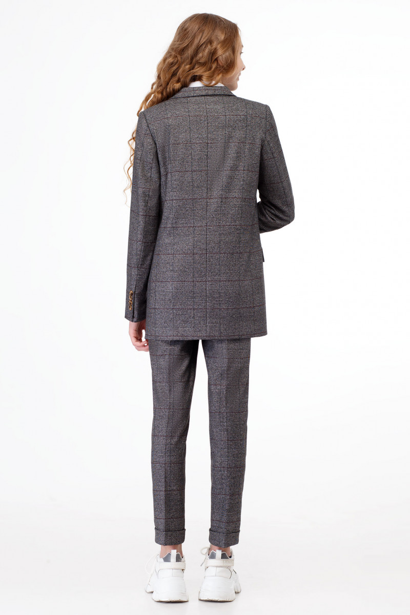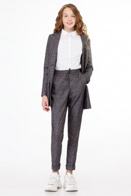 Жакет повседневный для девочки из полувискозной ткани на вискозной подкладки. Жакет полуприлегающего силуэта, с втачными рукавами. Жакет двубортный с застежкой на пуговицы. Детали переда с отрезными бочками, горизонтально расположенными боковыми прорезными карманами с клапаном в рамку и вытачками от разрезов карманов. Рукава двухшовные, локтевые швы заканчиваются шлицами. Воротник пиджачного типа. Такой жакет отлично сочетается как с брюками, так и с юбками, создавая современный образ школьника.