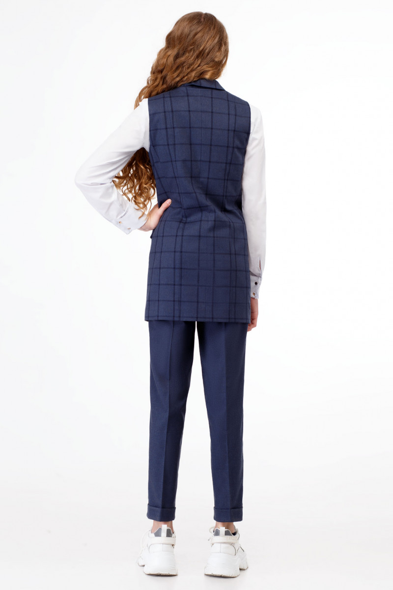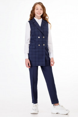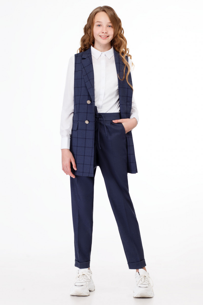 Стильная молодежная удлиненная жилетка для девочки. Жилет выполнен из вискозной ткани в клетку. Жилет двубортный на петли и пуговицы. Жилет с отрезными бочками, рельефными швами. По бокам горизонтальные карманы с клапаном. Жилет на притачной по низу подкладки. Отличный вариант для школьных дней.