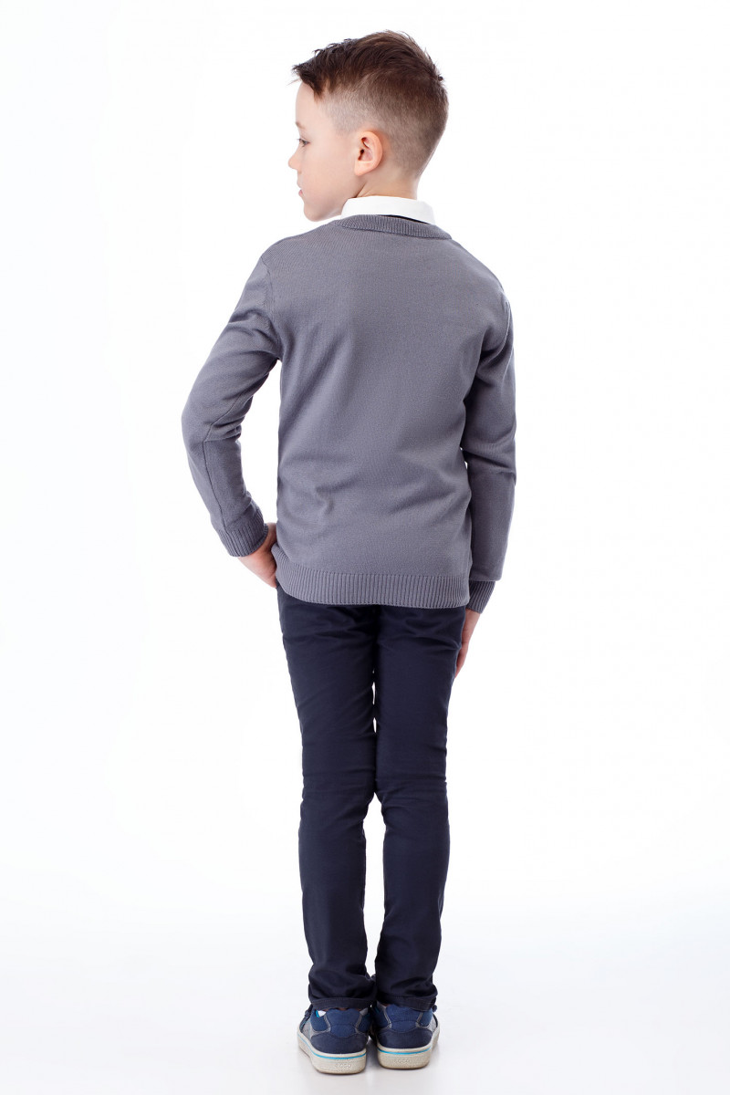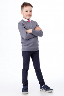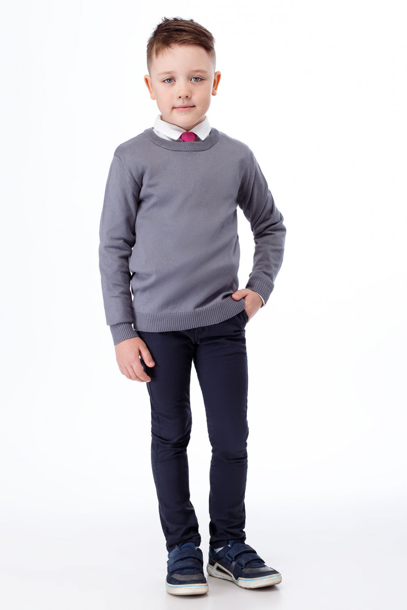 Джемпер для мальчика из мягкого трикотажа. Джемпер с длинными рукавами, с круглым вырезом горловины. Горловина окетлевана бейкой. По низу рукавов и низу изделия имеется цельновязанный эластичный манжет. Такой джемпер отличный вариант как для повседневных, так и для школьных дней.