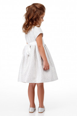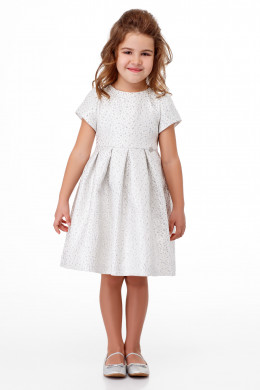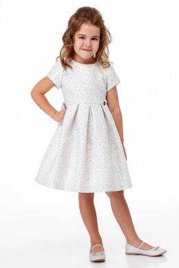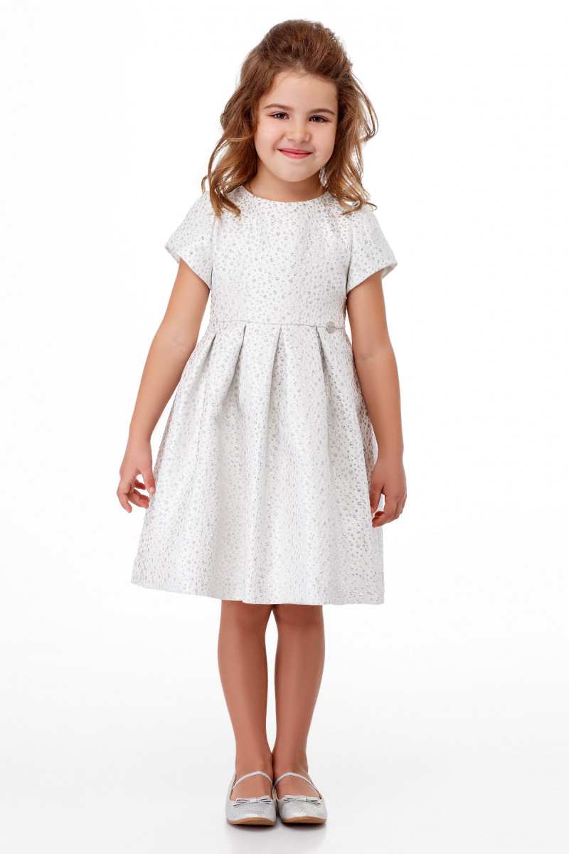 Нарядное детское платье из жаккардовой ткани с изящным блеском. Платье на хлопковой подкладки. Платье отрезное по талии, с короткими рукавами, с круглым вырезом горловины. Юбка с глубокими складками по переду и по спинке. В боковых швах ленты. Отличный нарядный вариант платья для маленьких принцесс.