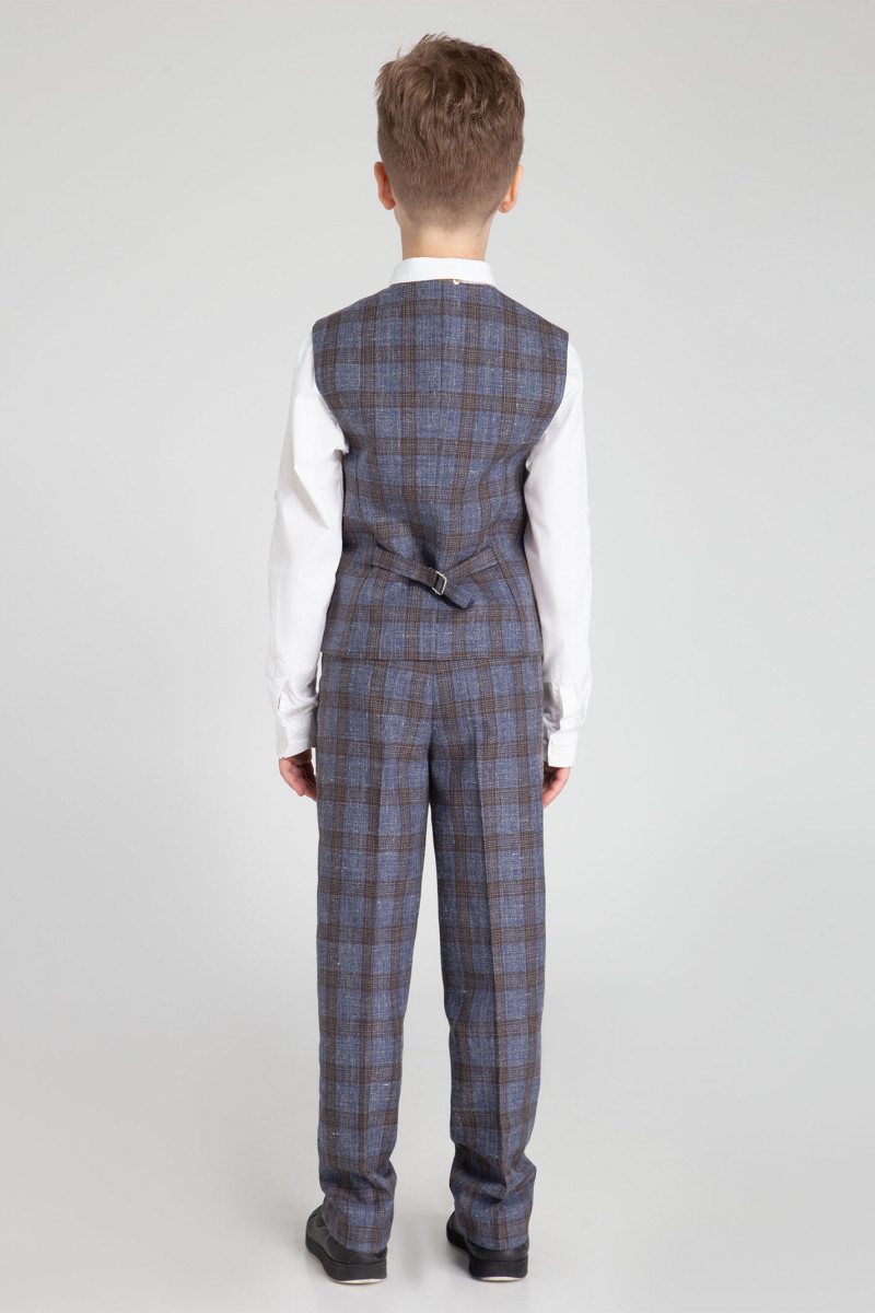 Жилет для мальчика на вискозной подкладке. Жилет полуприлегающего силуэта с центральной застежкой на пять петель и пуговицы, с V -образным вырезом горловины. Перед жилета с талиевыми вытачками. На боковых частях переда расположены боковые прорезные карманы с листочкой. Спинка со средним швом. По спинке имеется пата, которая позволяет регулировать степень прилегания жилета.