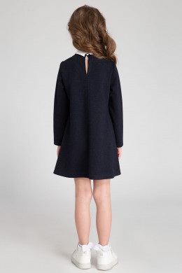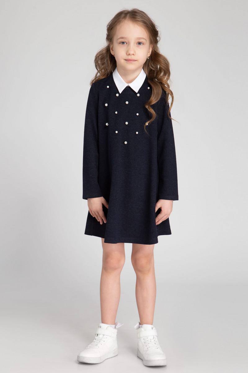 Комфортное и стильное платье для девочки из трикотажного вискозного полотна со съёмным белым воротничком из смесовой сорочечной ткани. Платье трапециевидного силуэта, длинной до колена. Рукав втачной, одношовный, длинный. Горловина с круглым вырезом, с застежкой на петлю и декоративную пуговицу по спинки. По переду платье декорировано пришивными бусинками. Платье отлично подходит для ежедневной носки в школу. Так же эта модель станет прекрасным решением для торжественных случаев.
