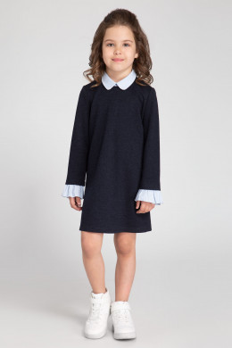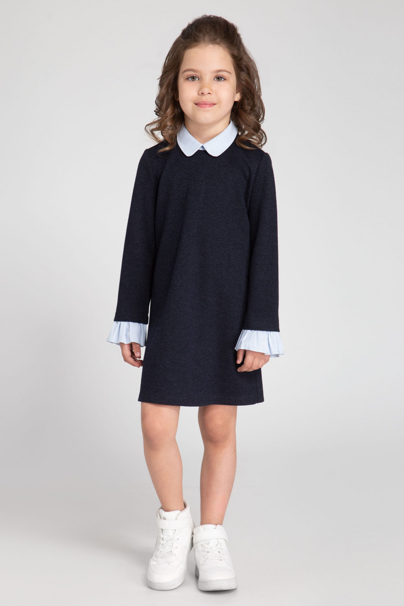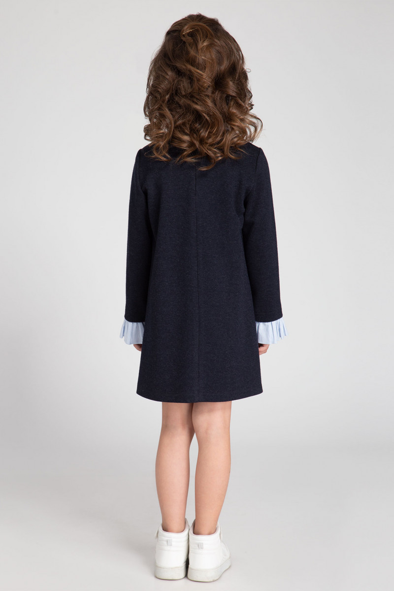 Стильное платье для девочки из трикотажного вискозного полотна с отделкой из хлопковой ткани с рисунком в полоску. Платье полуприлегающего силуэта с трапециевидным расширением к низу. Длинна платья - до колена. Горловина с сорочечным воротником, застегивающимся на петлю и пуговицу. На спинке расположена застежка на потайную тесьму- молнию, расположенную в среднем шве. Рукава втачные, длинные, одношовные. По низу рукавов притачан волан со сборкой из хлопковой ткани с рисунком в полоску. Комфортное и практичное платье станет прекрасным выбором для школьницы.