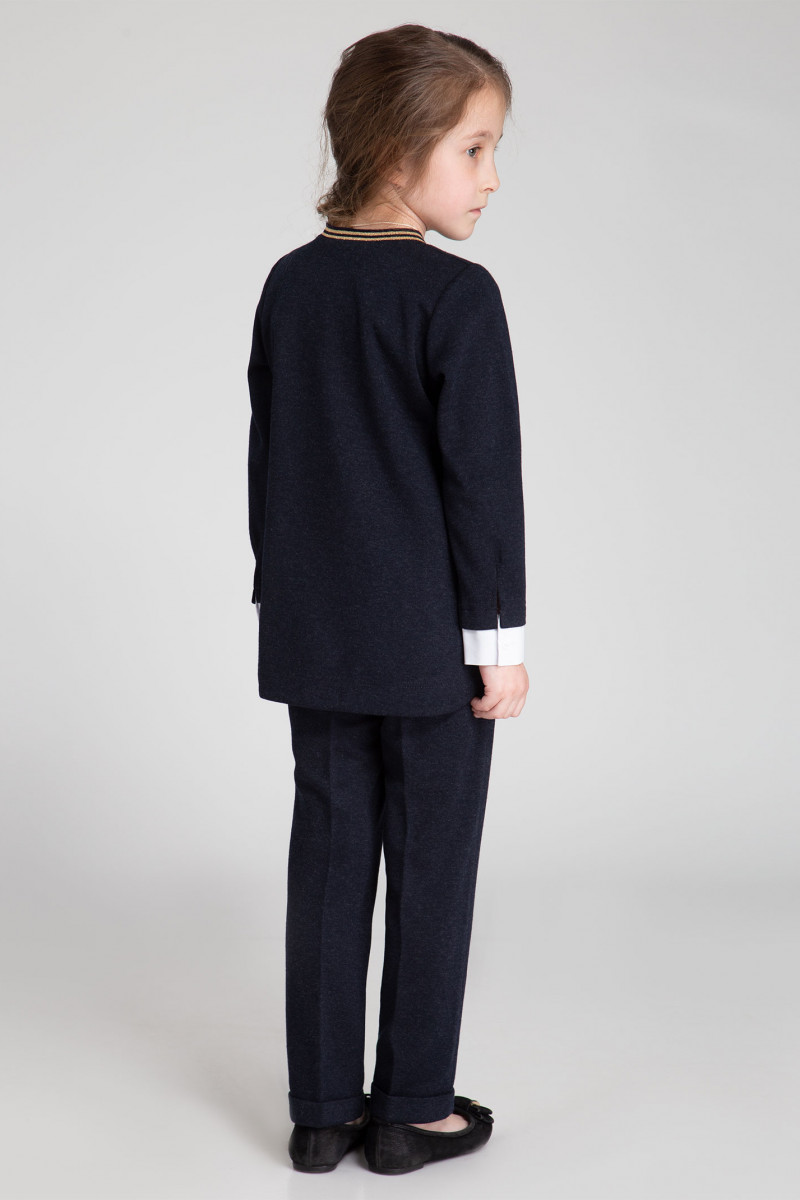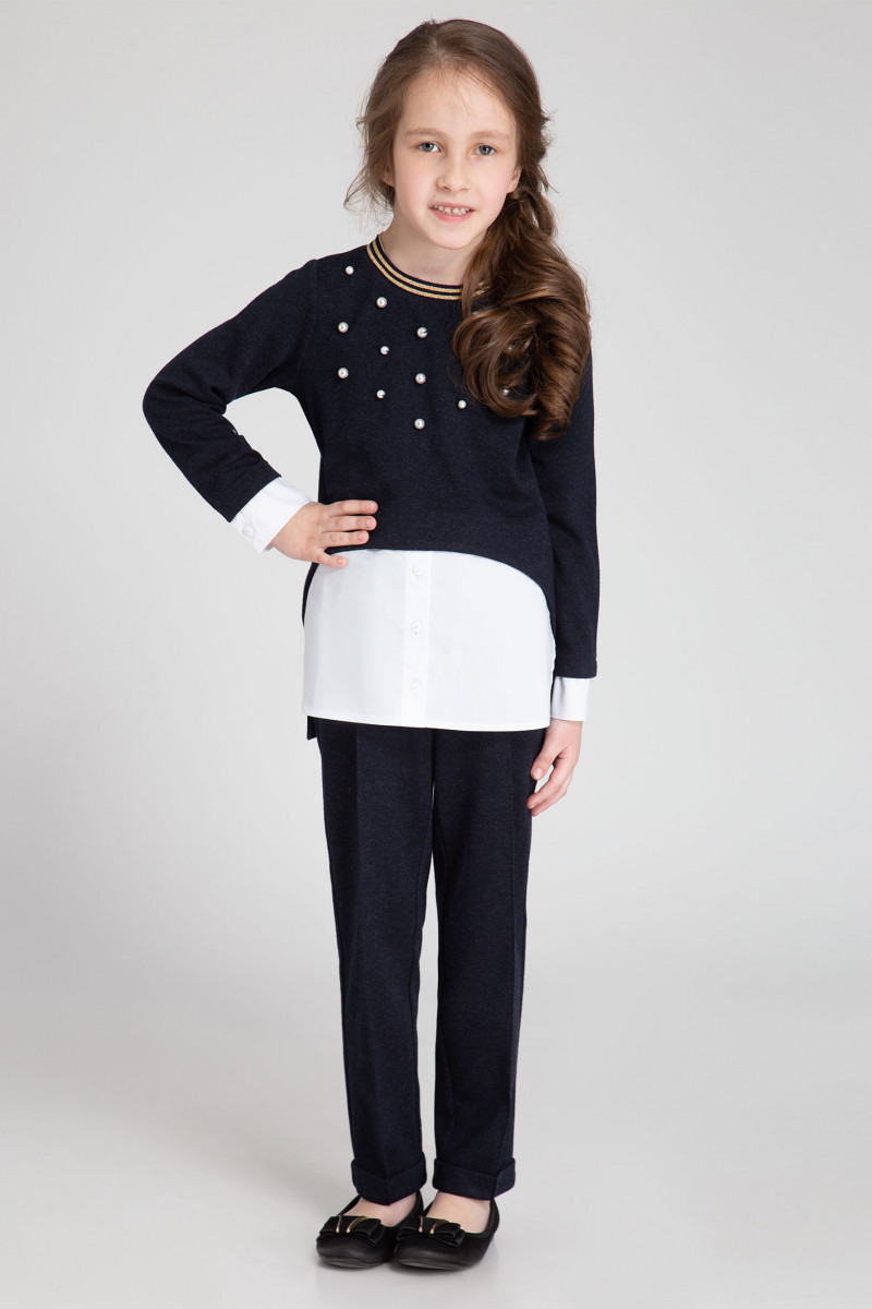 Стильный джемпер для девочки из трикотажного вискозного полотна с имитацией втачной рубашки из сорочечной ткани. Низ джемпера имеет фигурную форму: длинна переда укороченная, спинка - удлиненная. Круглая горловина обработана декоративным эластичным довязом, который обеспечивает удобство при одевании джемпера. Рукава джемпера втачные, длинные, с притачной манжетой из сорочечной ткани. Притачной манжет выполнен с застежкой на прорезную петлю и пуговицу. Перед изделия декорирован пришивными бусинами в области груди. Так же на переде в области отрезной сорочечной детали выполнена центральная застежка на петли- пуговицы.