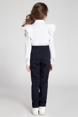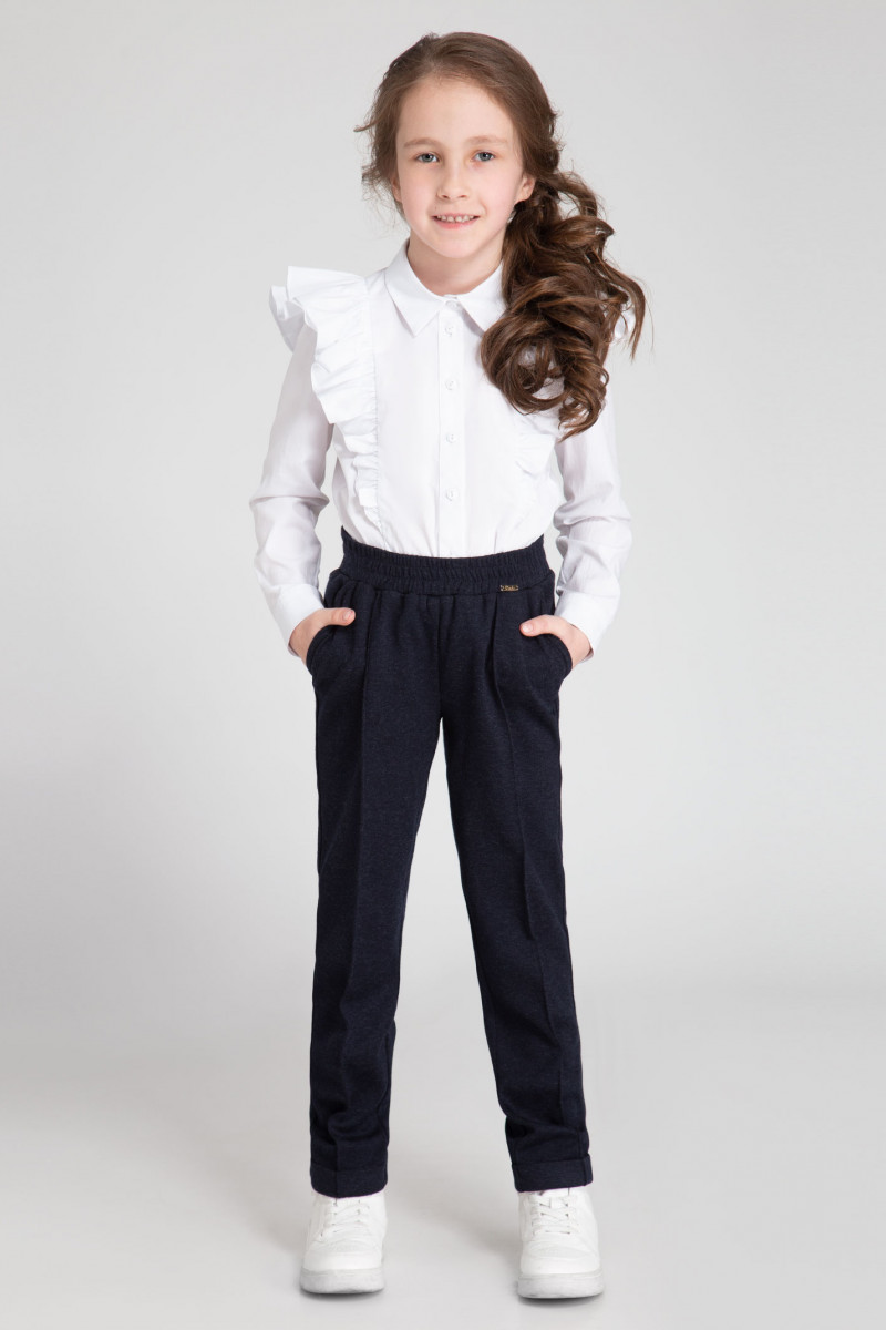 Лаконичные брюки для девочки из трикотажного вискозного полотна. Брюки на талии, на эластичной широкой резинка. Так же на поясе расположен декоративный элемент лейба металлическая. Брюки прямые, к низу чуть заужены. По низу выполнен зафиксированный подворот. По переду каждой брючины имеются декоративные застроченные защипы, имитирующие стрелки. По бокам переда расположены карманы. Трикотажные брюки из натуральной ткани станут отличным решением для повседневной носки в школу. Лаконичность и простота кроя создает классический образ в новом прочтении.