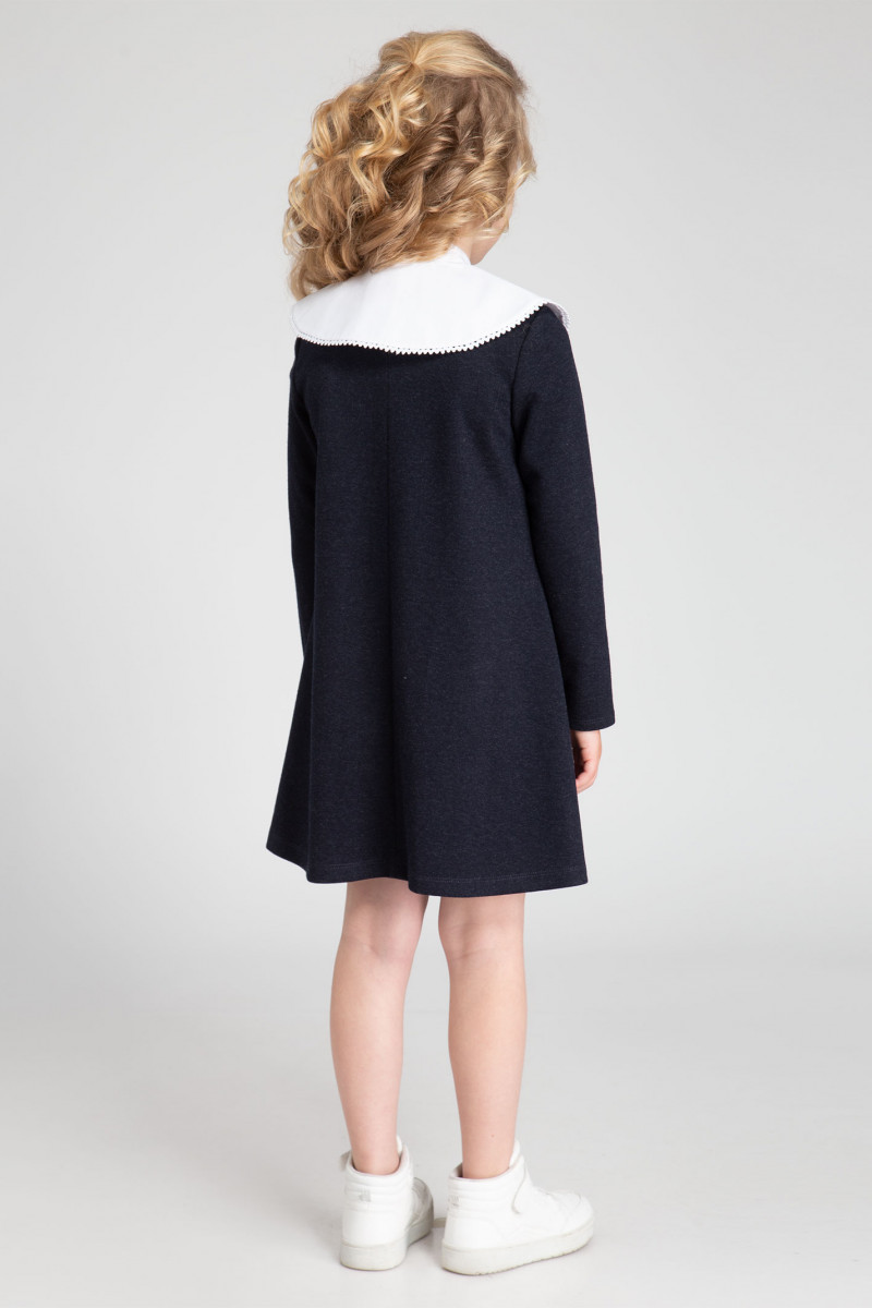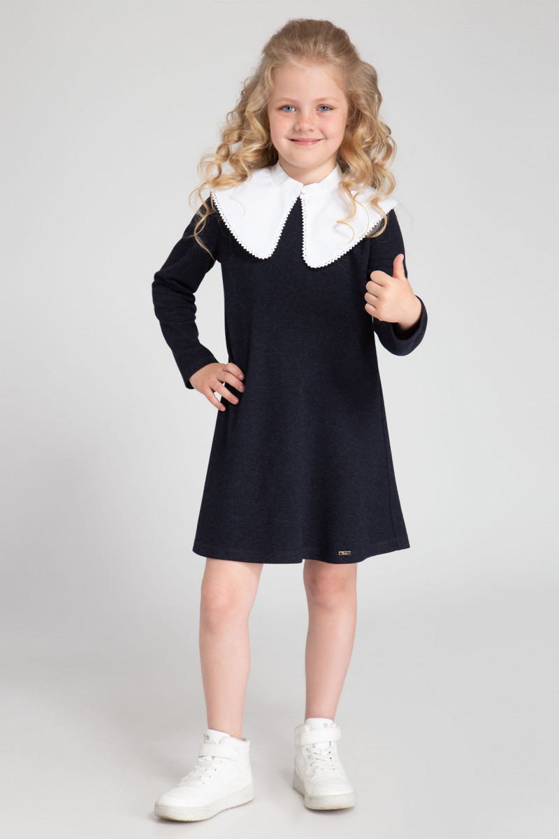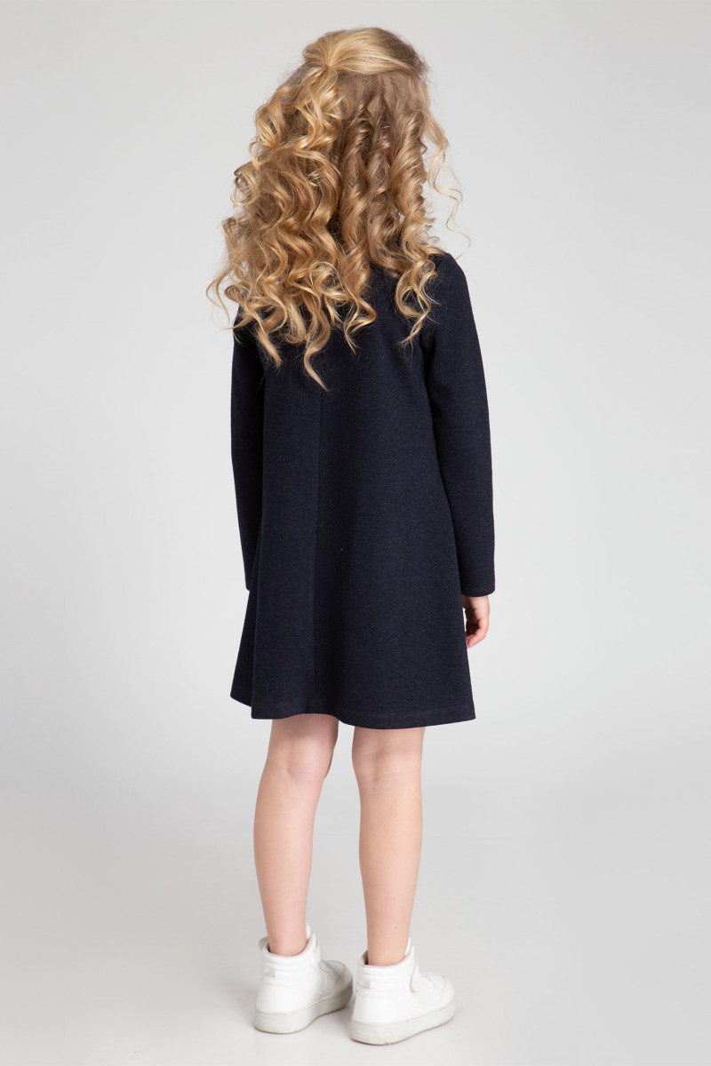 Базовое платье для девочки из трикотажного вискозного полотна. Силуэт платья - трапеция. Горловина платья круглая. Рукава длинные, втачные, одношовные. Спинка со средним швом. В верхней части среднего шва спинки расположен разрез и застежка на пуговицу на ножке и петлю из сутажа. На переде платья по низу расположен декоративный элемент лейба металлическая. Платье обеспечит комфорт и удобство. Такое базовое платье отличный вариант для школьных будней.