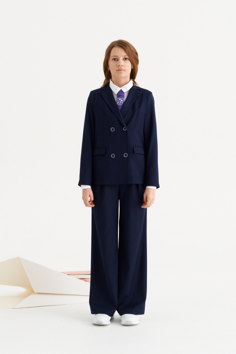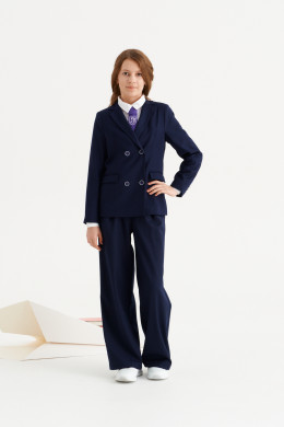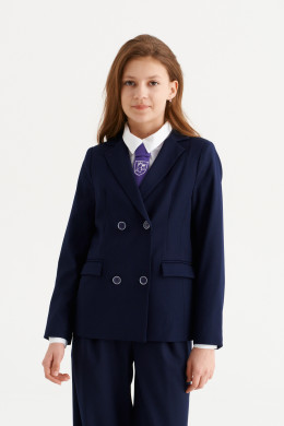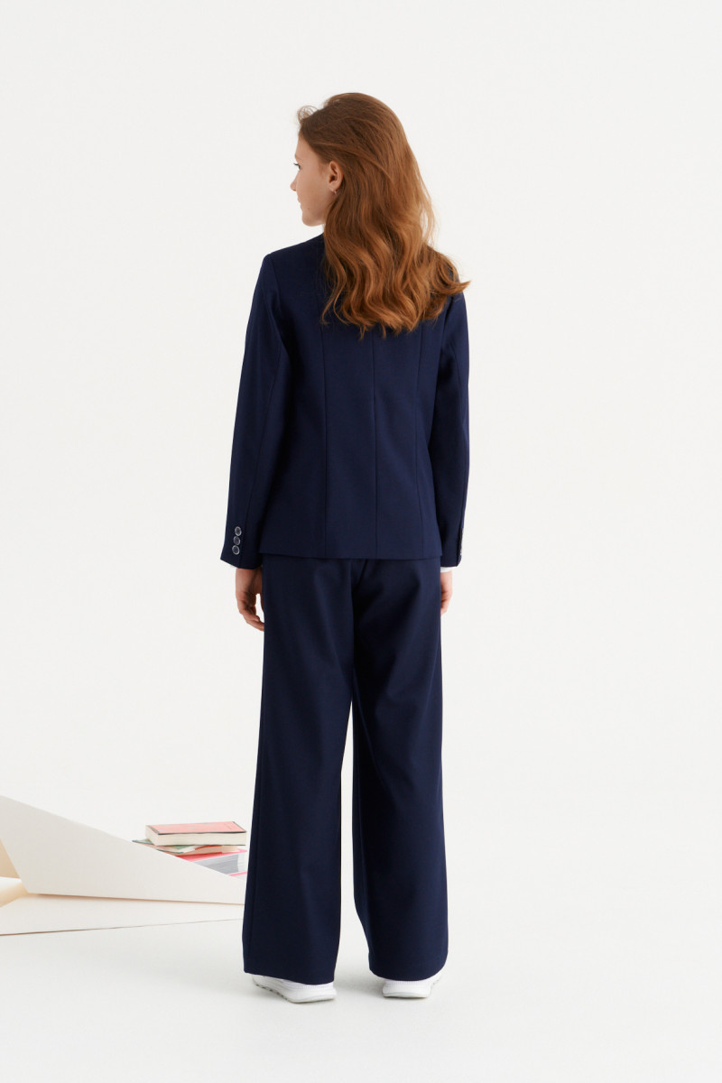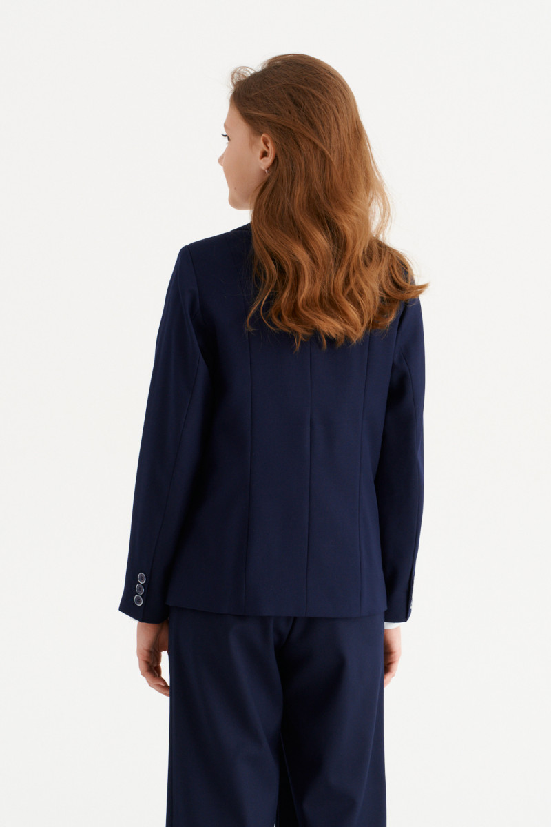 Жакет для девочки полуприлегающего силуэта с центральной застежкой на три петли и пуговицы, с V-образным вырезом горловины, с втачными рукавами.