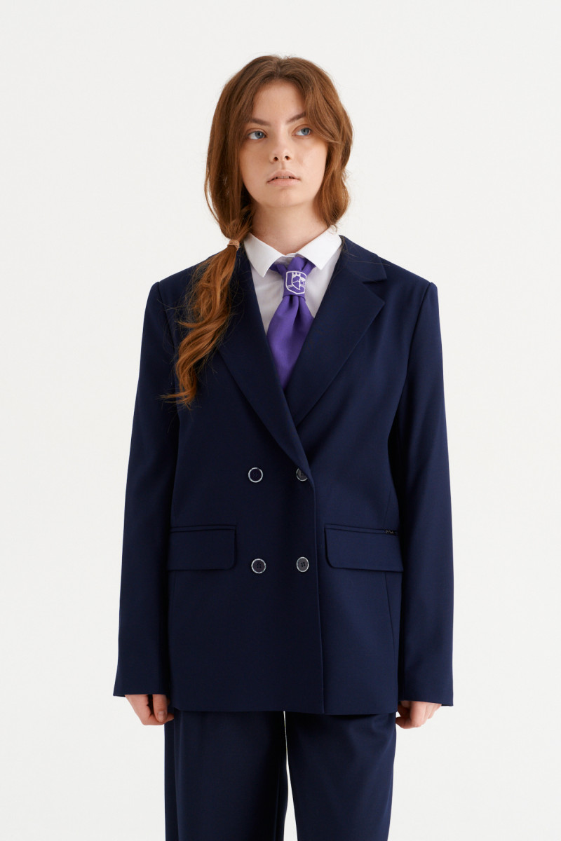 Жакет для девочки полуприлегающего силуэта с центральной застежкой на три петли и пуговицы, с V-образным вырезом горловины, с втачными рукавами.