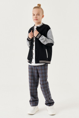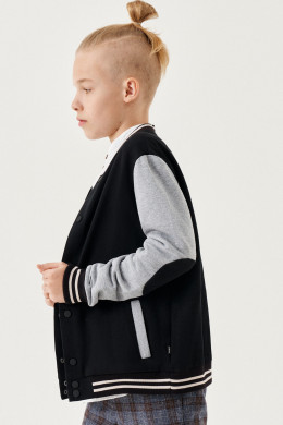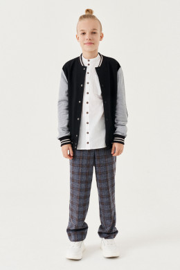 Бомбер для мальчика младшего школьного возраста из трикотажного полотна. Бомбер прямого силуэта, с центральной застежкой на кнопки, с воротником стойка, с карманами по переду. Низ рукавов и низ бомбера обработан притачными манжетами-довязами.