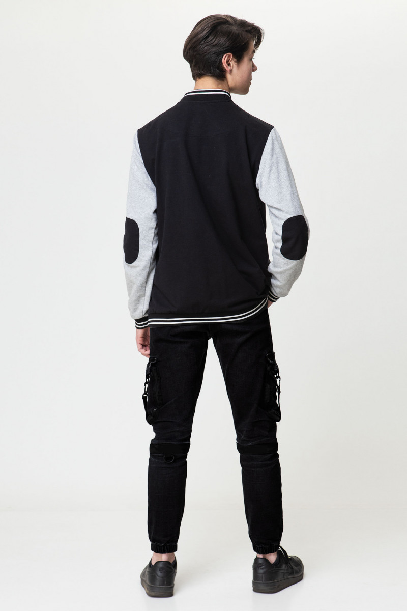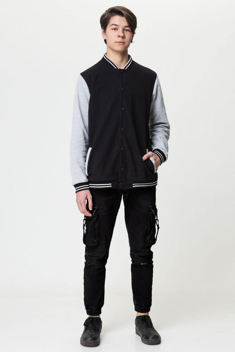 Бомбер для мальчика старшего школьного возраста из трикотажного полотна. Бомбер прямого силуэта, с центральной застежкой на кнопки, с воротником стойка, с карманами по переду. Низ рукавов и низ бомбера обработан притачными манжетами-довязами.