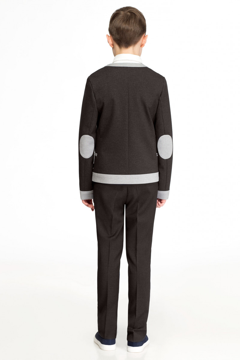 Строгий кардиган для мальчика младшего школьного возраста из трикотажного полотна. Кардиган полуприлегающего силуэта с рельефами по переду и по спинке, со сквозной застежкой на петли и пуговицы.По низу кардигана и по низу рукавов притачная манжета. Рукава длинные двухшовные. На локтях настрочные налокотники. По переду прорезные карманы в рамку.