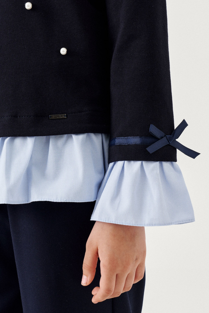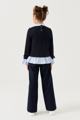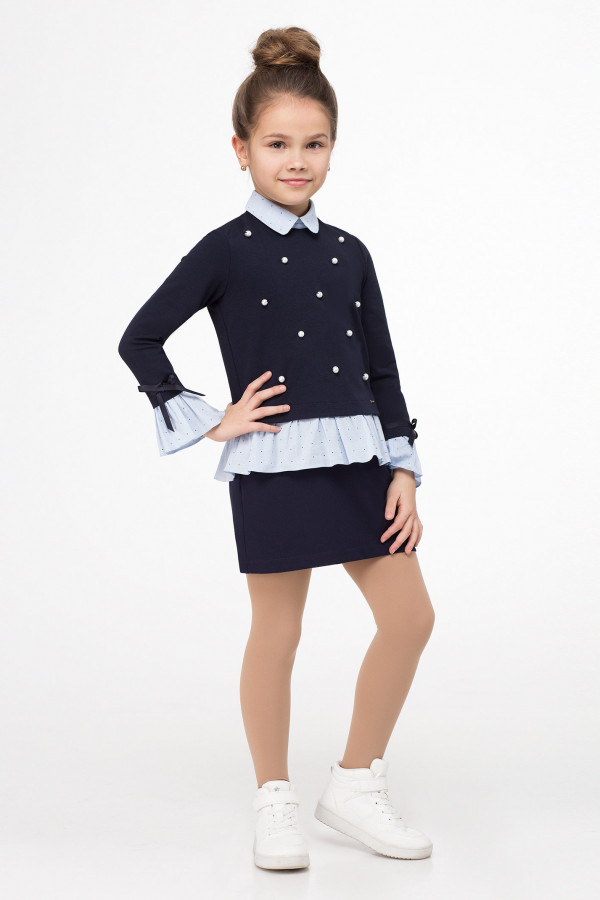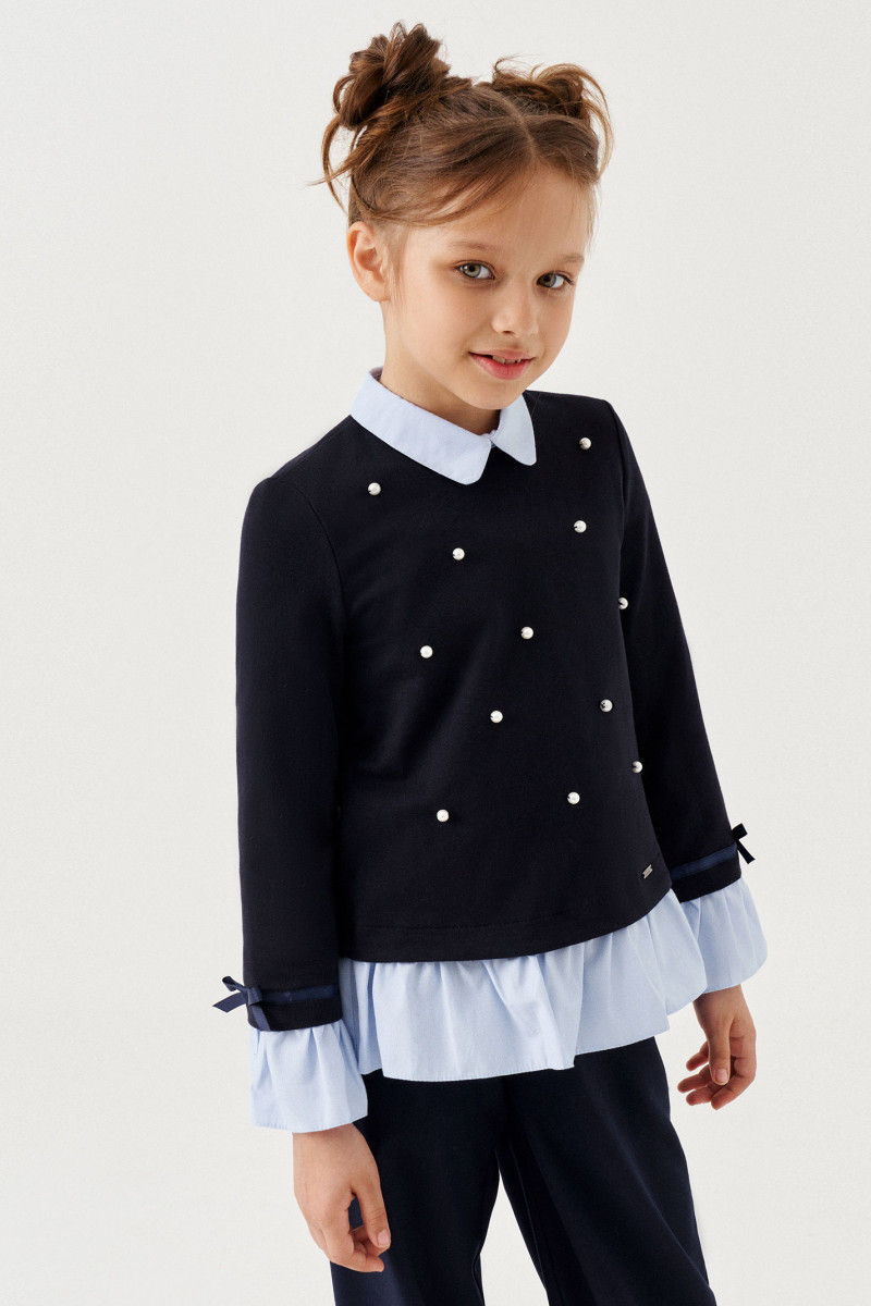 Стильный модный джемпер для девочки из хлопкового трикотажного полотна с отделкой из хлопковой ткани с рисунком в полоску. Джемпер прямого силуэта, с сорочечным воротником из хлопковой ткани с рисунком в полоску, с застежкой на петлю и пуговицу на воротнике. Рукава втачные длинные, по низу рукава притачен манжет из хлопковой ткани с рисунком в полоску. Над манжетами настрочена атласная лента, которая завязывается в декоративный бантик. По переду джемпер украшен бусинками. Джемпер отлично сочетается как с брюками, так и с юбками. Такой джемпер станет прекрасным выбором школьника.