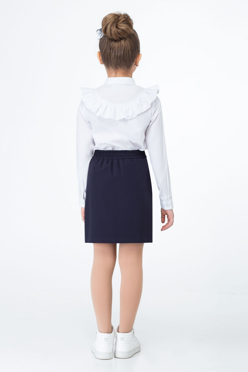 Модная блузка для девочки из смесовой сорочечной ткани. Блузка прямого силуэта, с центральной застежкой на петли и пуговицы и одну петлю и пуговицу на воротнике. По переду и по спинки имеется подрез в который вставлена декоративная рюша. Рукава одношовные с притачными манжетами, застегивающимися на петлю и пуговицу. Разрезы рукавов обработаны окантовкой. Блузка дополнена оригинальной дизайнерской вышивкой по горловине. Такая блузка отлично сочетается с различными юбками и брюками, создавая очень стильный и модный образ ребенка.
