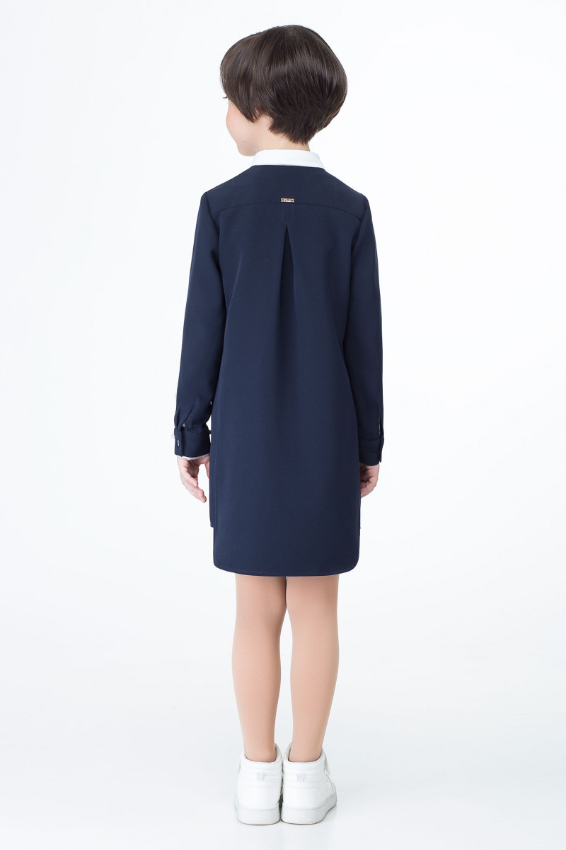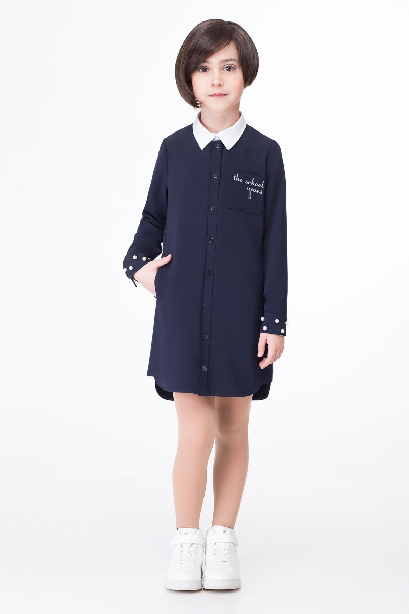 Стильное модное "платье-рубашка" для девочки младшего школьного возраста. Платье со съёмным воротником, что очень практично в уходе. Платье прямого силуэта, с отрезными бочками, с длинными рукавами на притачной манжете, с глубокой складкой по спинки. Платье с центральной сквозной застежкой по переду на петли и пуговицы. В боковых швах имеются карманы. На левой части переда сверху имеется большой накладной карман. Платье дополнено изящной печатью на кармане и декоративными бусинками по манжетам. Очень стильное и модное платье для современной школьницы.