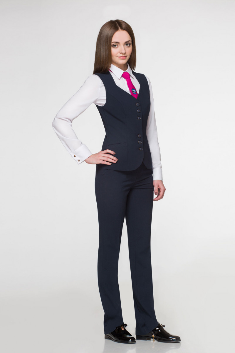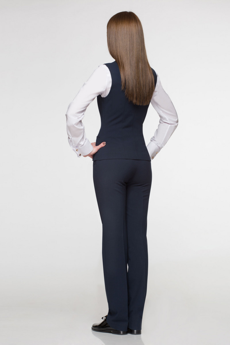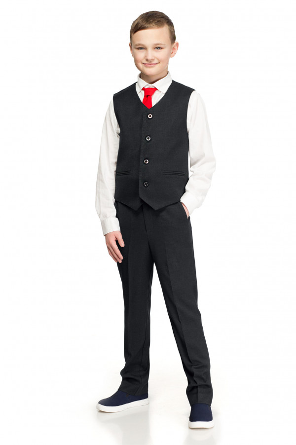 Жилет для девочки полуприлегающего силуэта с центральной застежкой на петли и пуговицы, с фигурным вырезом горловины.