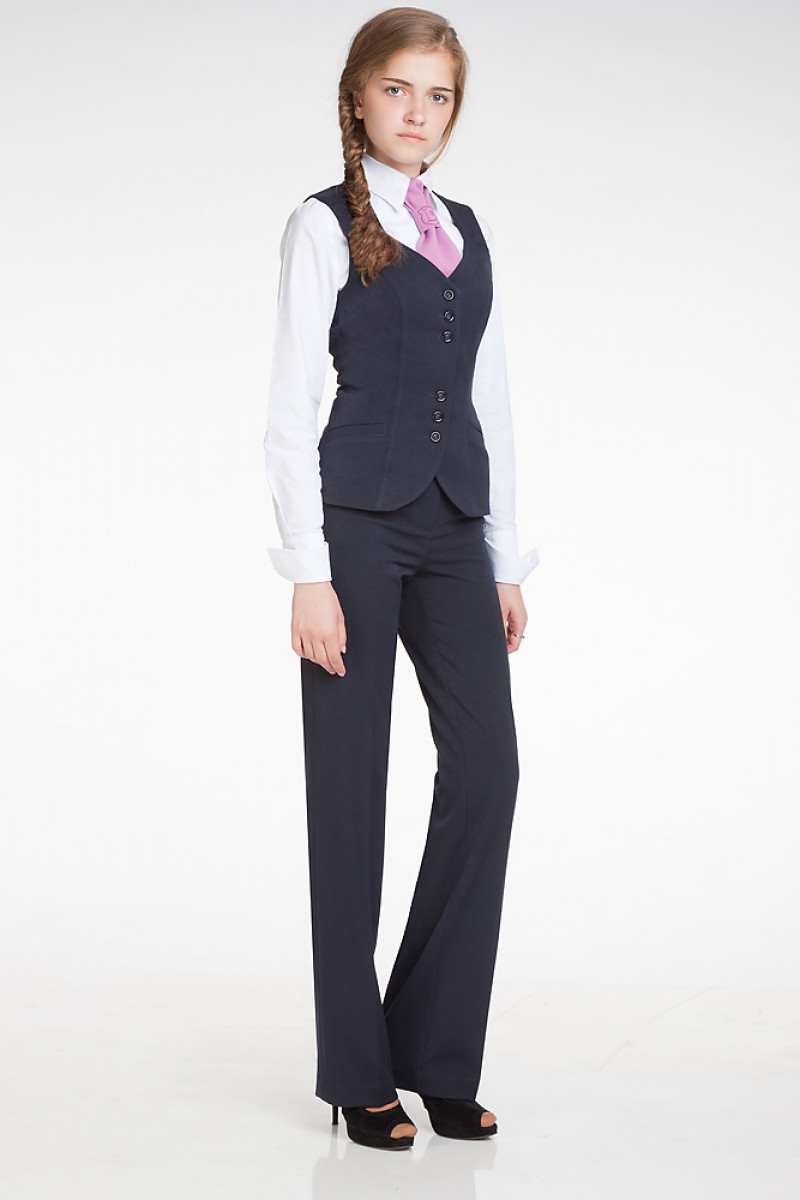Брюки для девочки на талии, прямого силуэта, с притачным поясом на резинке, застегивающимся на одну петлю и пуговицу на поясе, и тесьму-молнию. По поясу расположены шлевки.