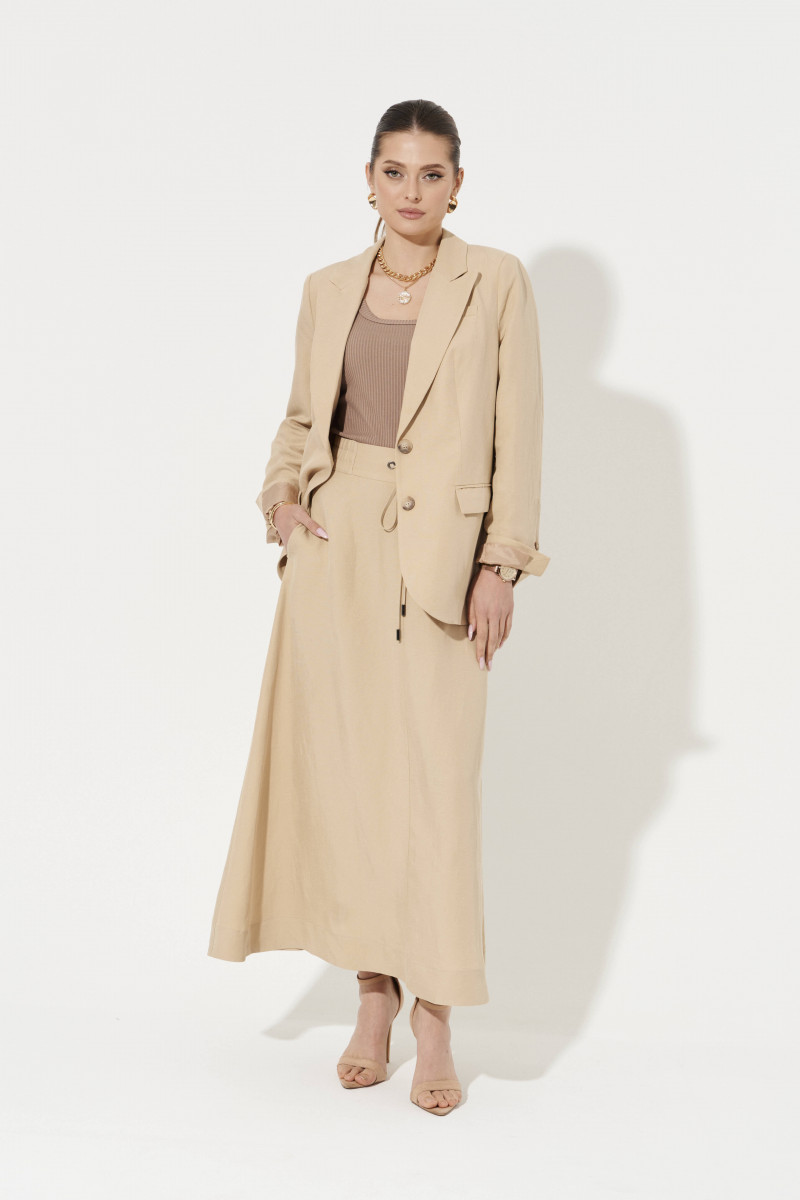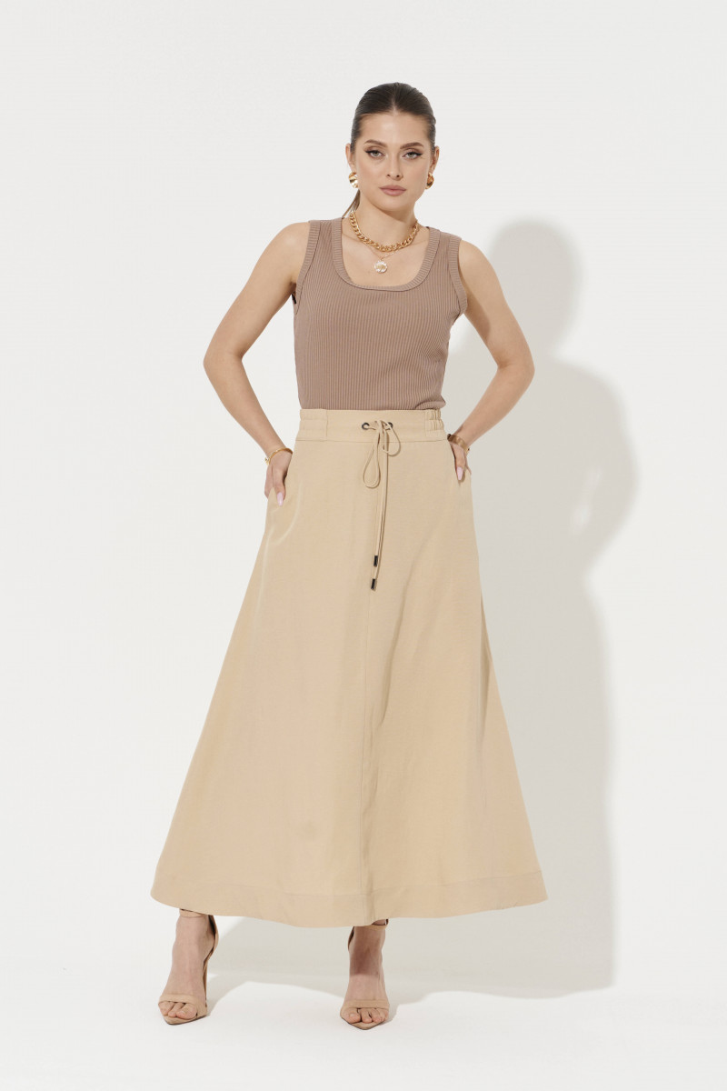Юбка женская из смесовой ткани для повседневной носки. Юбка, расширенная к низу. Верхний срез юбки обработан притачным поясом со вставкой на резинке в боковой части пояса. В поясе имеются шнурки для регулирования облегания. Переднее полотнище юбки со средним швом. Заднее полотнище со средним швом и небольшой застежкой-молнией в шве. В боковом шве имеются потайные карманы. Длина юбки миди. Красивая и удобная юбка бежевого оттенка обязательно осчастливит вас своим внешним видом, а немаловажным плюсом является лен в составе материала. За счет своей интересной конструкции она обязательно будет стильно смотреться на вас.
