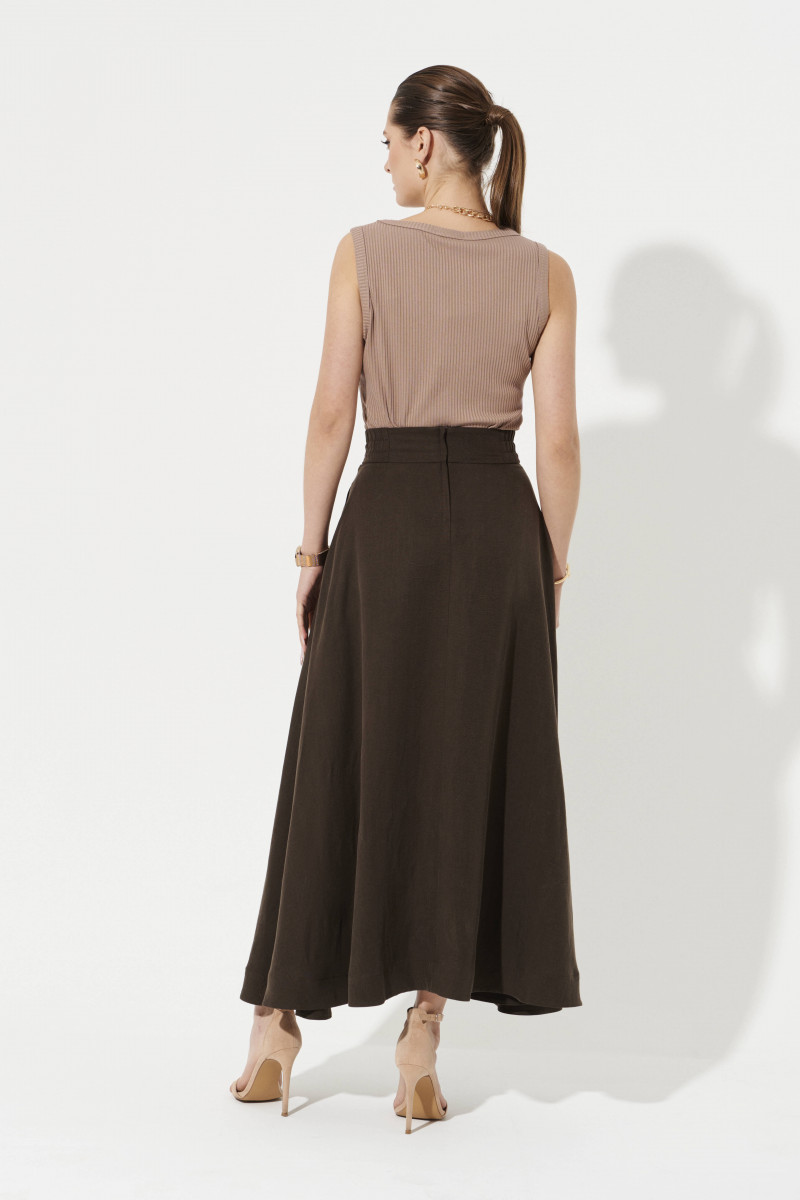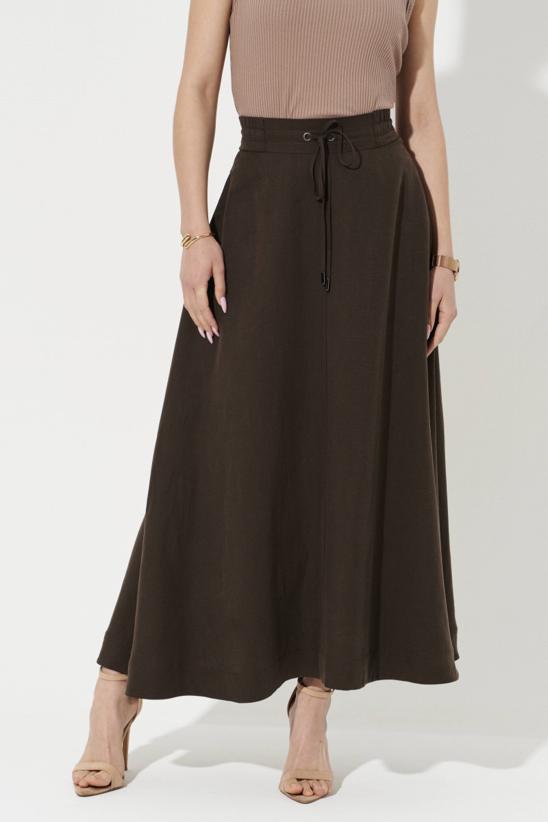 Юбка женская из смесовой ткани для повседневной носки. Юбка, расширенная к низу. Верхний срез юбки обработан притачным поясом со вставкой на резинке в боковой части пояса. В поясе имеются шнурки для регулирования облегания. Переднее полотнище юбки со средним швом. Заднее полотнище со средним швом и небольшой застежкой-молнией в шве. В боковом шве имеются потайные карманы. Длина юбки миди. Красивая и удобная юбка коричневого оттенка обязательно осчастливит вас своим внешним видом, а немаловажным плюсом является лен в составе материала. За счет своей интересной конструкции она обязательно будет стильно смотреться на вас.