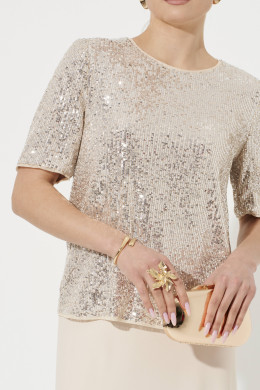 Женская блузка из вискозной ткани прямого силуэта предназначена для повседневной носки. Модель украшена пайетками, что придает ей изящный и праздничный вид. Спинка с средним швом и застежкой-молнией в шве обеспечивают удобство при надевании и хорошую посадку. Низ изделия обработан окантовочной сеткой, которая повторяет отделку горловины и рукавов, а также придает блузке завершенный и стильный вид. Втачные рукава чуть ниже локтя с обработкой окантовочной сеткой создают аккуратный и элегантный образ. Блузка на вискозной подкладке отлично сидит на любой фигуре, подчеркивая женственность и стильность. Эта красивая и элегантная модель станет отличным дополнением к вашему гардеробу для особых случаев или повседневных образов.