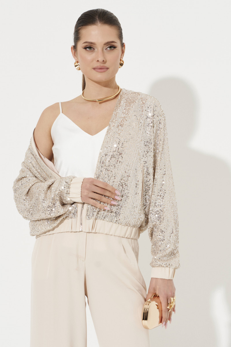 Жакет женский из нарядной ткани в пайетки. Жакет с длинным втачным рукавом. По низу рукава манжета на резинке. По переду имеются прорезные карманы в рамку. Горловина обработана стойкой. Застежка на молнию, вдоль которой отделочные планки. По низу жакета притачной пояс с резинкой. Планки вдоль молнии, манжеты, пояс по низу изделия оформлены деталями из атласной ткани. Жакет на вискозной подкладке. В этом нарядном жакете вы будете неотразимы!