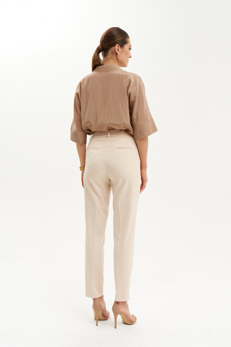 Блузка женская из смесовой ткани с большим содержанием хлопка для повседневной носки. Застежка центральная бортовая на обметанные петли и пуговицы. В боковых швах имеются небольшие разрезы. Горловина обработана рубашечным воротником с отрезной стойкой. Рукава цельнокроеные, длина чуть ниже локтя, низ рукава обработан притачной манжетой. Красивая и легкая блузка в бежевом цвете станет не заменимой вещью в вашем гардеробе.