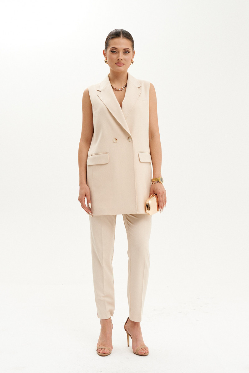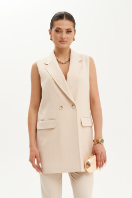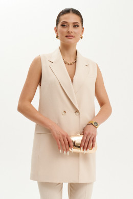 Жилет женский из смесовой костюмной ткани на подкладке полуприлегающего силуэта. Жакет двубортный на одну обметанную петлю и одну пуговицу. Перед имеет два прорезных кармана в рамку с двумя обтачками, а также на груди располагается карман с листочкой. Жилет с бочком. Спинка имеет средний шов и шлицу по низу изделия. Горловина обработана пиджачным воротником. Жилет без рукавов. В жилете имеются отделочные строчки в виде "ручного стежка” по воротнику, уступу лацкана, лацкану и по краю борта. Длина жилета чуть ниже бедер. Очень красивый и утончённый жилет с которым вы сможете создавать множество модных образов.