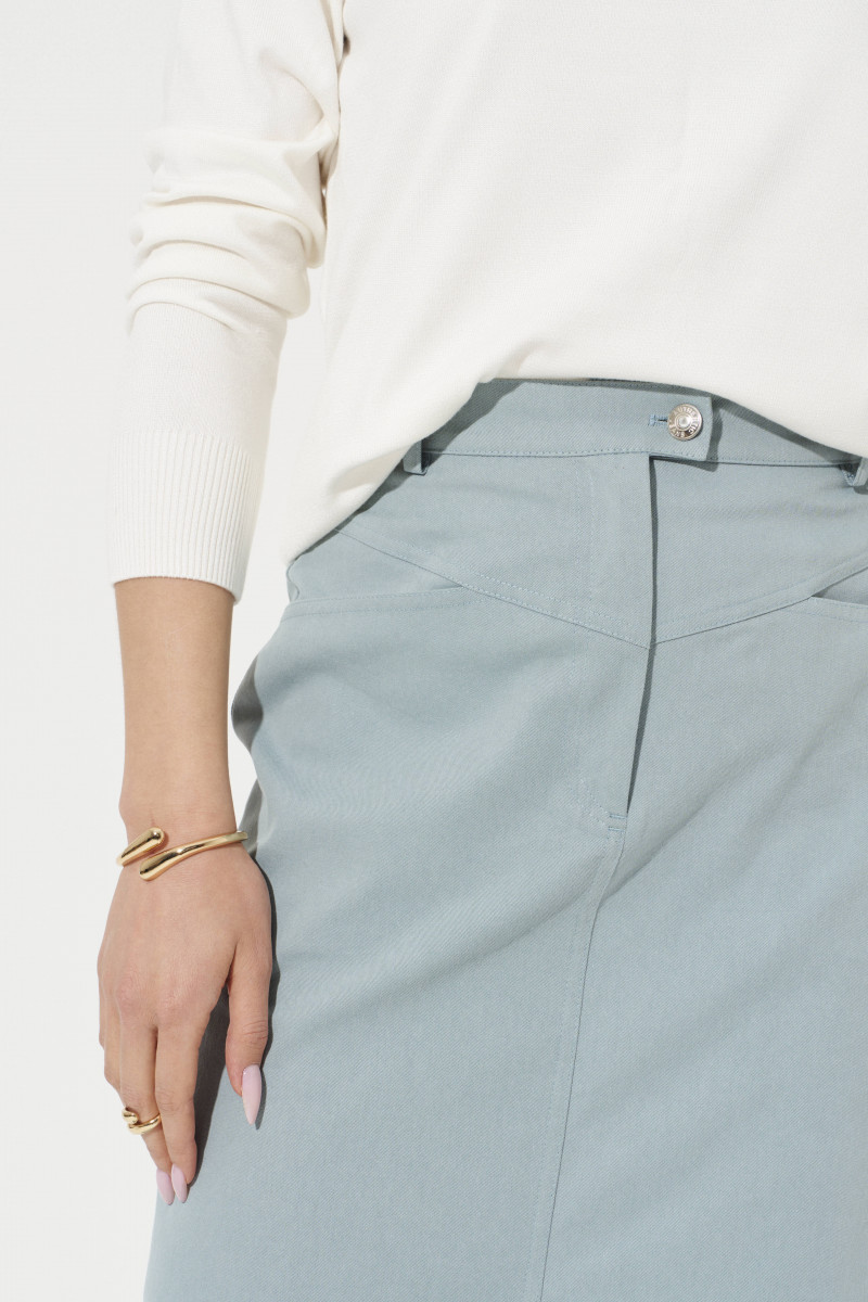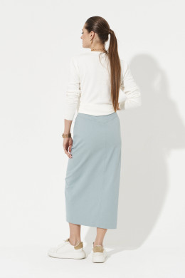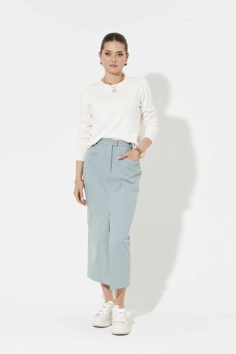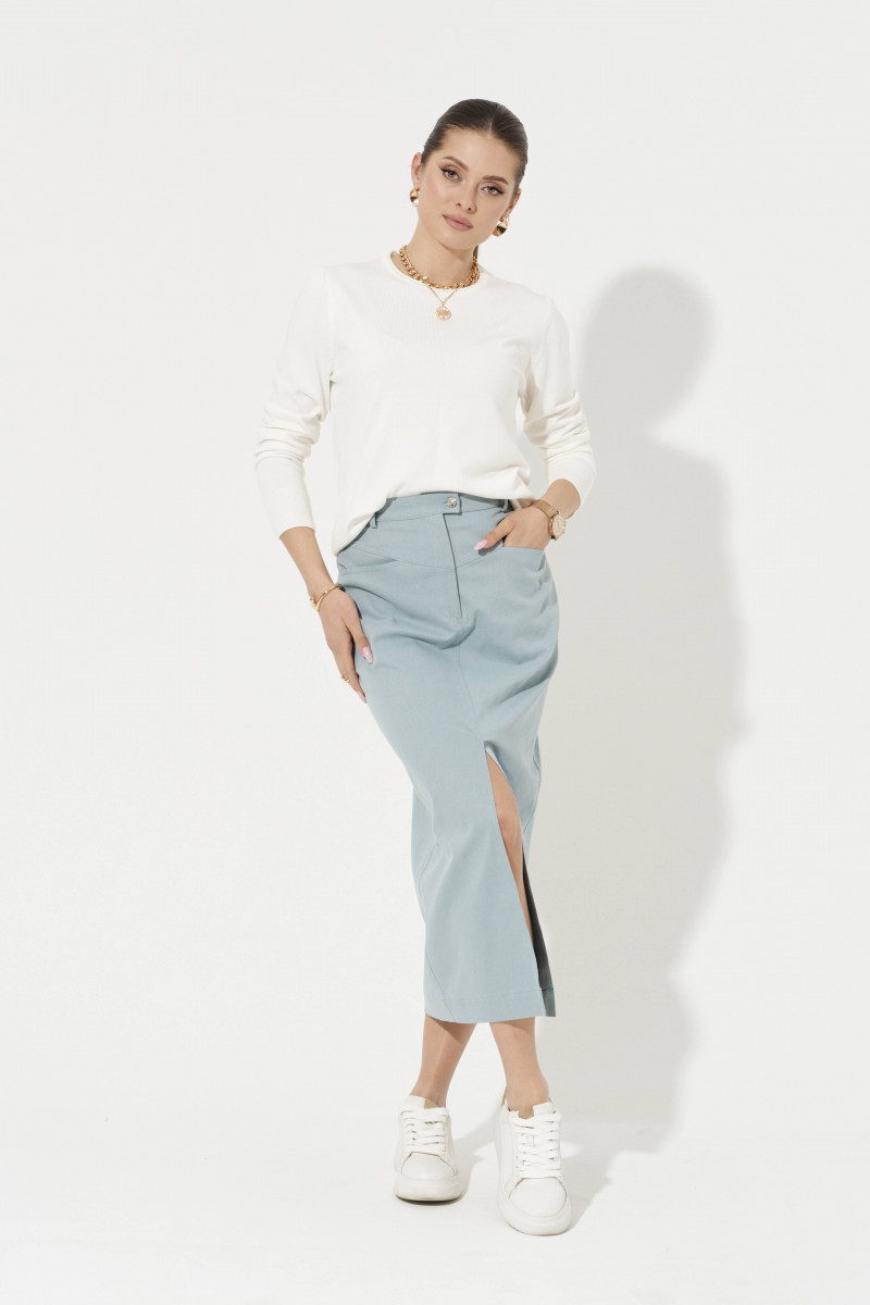Юбка женская из смесовой ткани с большим содержание хлопка для повседневной носки. Юбка прямая. Верхний срез юбки обработан притачным поясом с застежкой на одну обметанную петлю и одну пуговицу, а также имеется застежка на тесьму-молнию в среднем шве юбки. Юбка имеет шлевки, что дает возможность носить ее под пояс, тем самым вы сможете регулировать облегание в области талии. Переднее полотнище юбки имеет отрезную кокетку, а также на переднем полотнище располагаются два кармана. Переднее полотнище со средним швом и разрезом в шве. Заднее полотнище юбки имеет отрезную кокетку. Очень стильная юбка молочного оттенка, которая безусловно будет радовать вас своим чудесным видом и прекрасной посадкой.