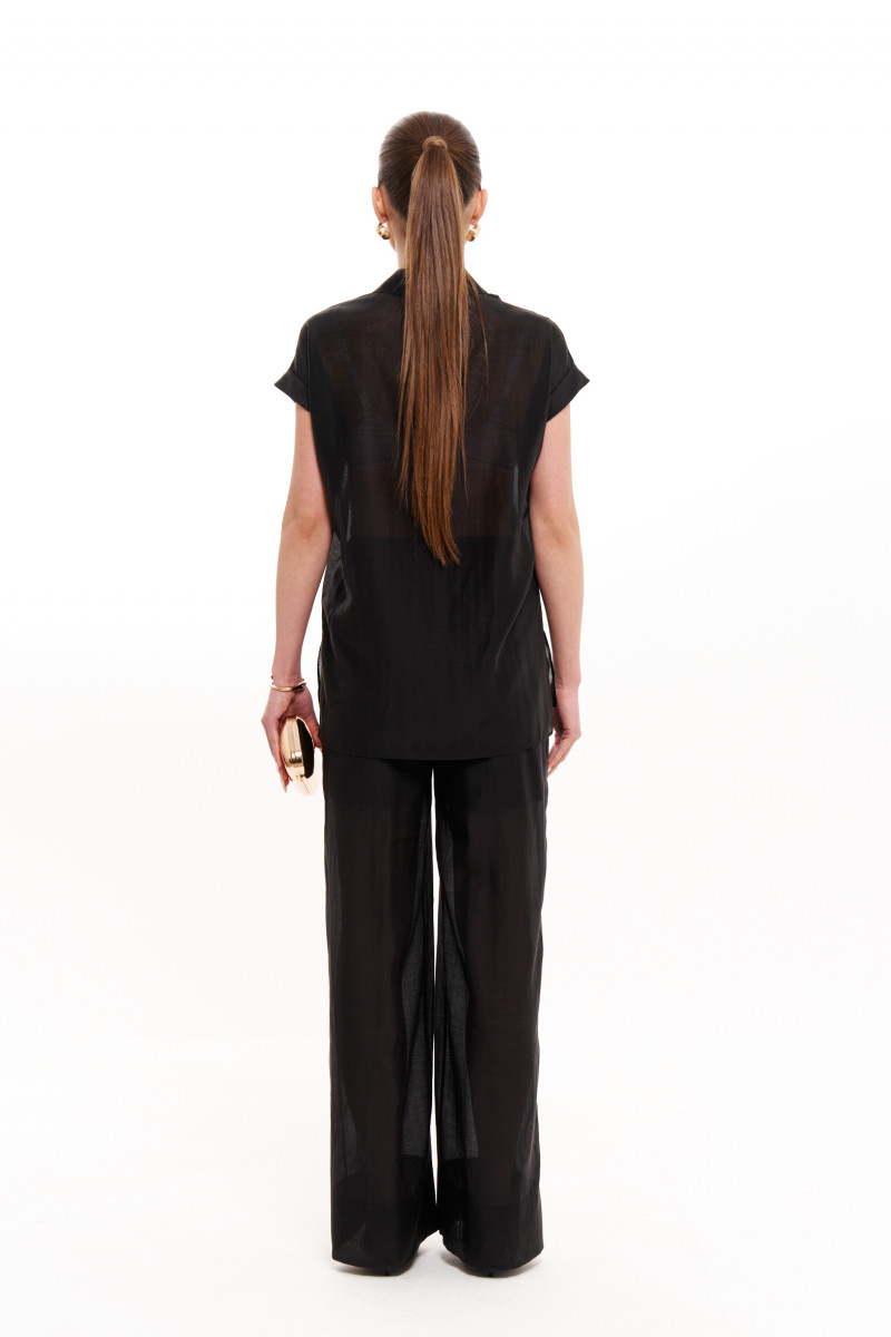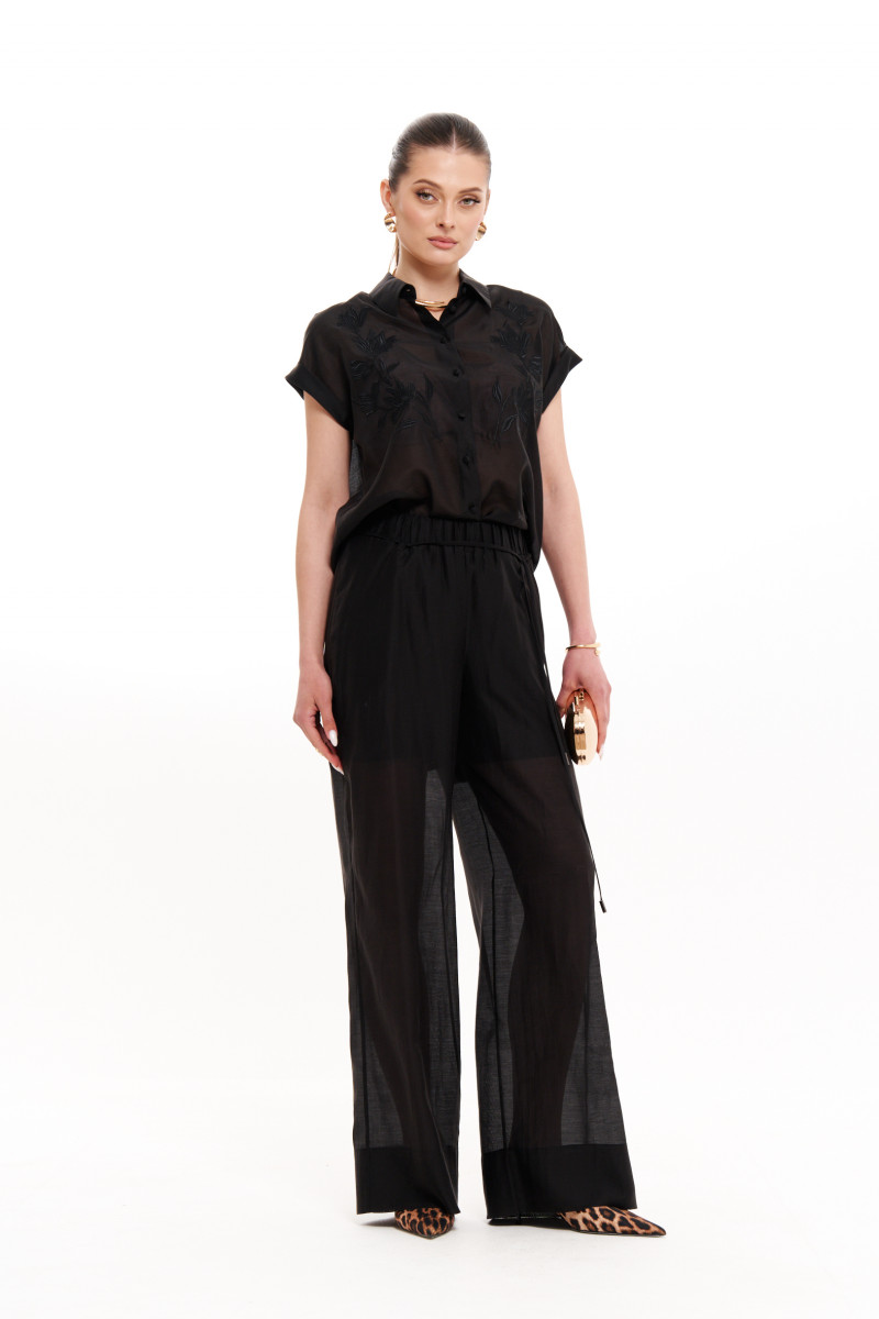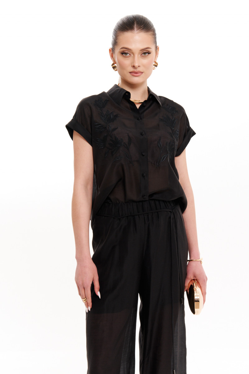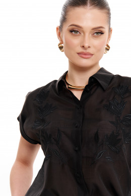 Блузка женская из струящейся, прозрачной ткани для повседневной носки либо для тожественных случаев Блузка прямого силуэта. Застежка центральная бортовая на обметанные петли и пуговицы. Перед имеет дизайнерскую вышивку в виде цветов. В боковом шве имеются небольшие разрезы. Горловина обработана рубашечным воротником с отрезной стойкой. Линия плеча чуть спущенна. Рукава короткие, низ рукава обработан отлетной манжетой. Стильная и воздушная блузка в черном цвете, обязательно придаст вашему образу дольку раскрепощенности за счет лёгкой прозрачности.