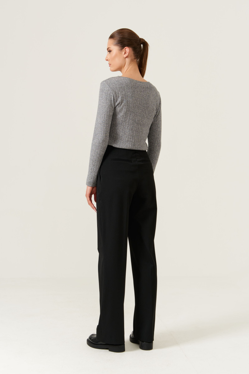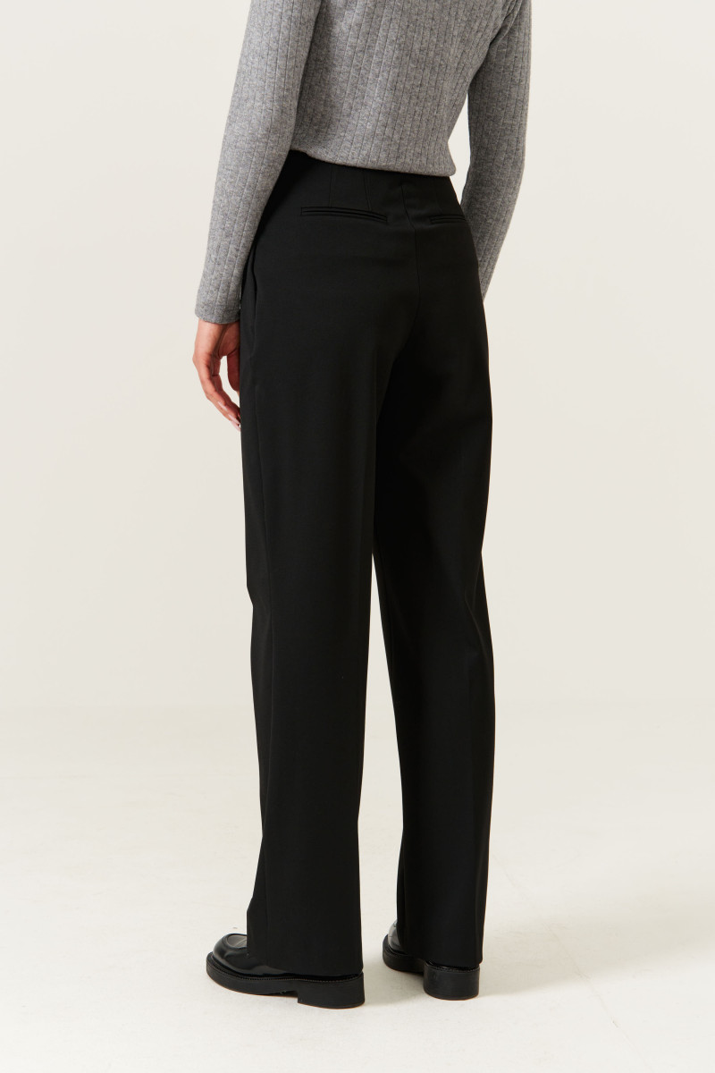 Брюки женские прямые из поливискозной ткани с начёсом для повседневной носки в холодные дни. Верхний срез брюк обработан обтачкой, застежка на один крючок, а также имеется застежка на тесьму-молнию в среднем шве брюк. Задняя часть брюк имеет четыре талиевые вытачки, а также два прорезных кармана в рамку с двумя обтачками. Отличный вариант брюк в классическом черном оттенке, которые будут гармонично смотреться под любые изделия. В данных брюках вам будет очень комфортно и тепло за счет имеющегося начеса.