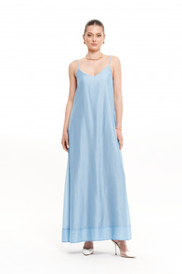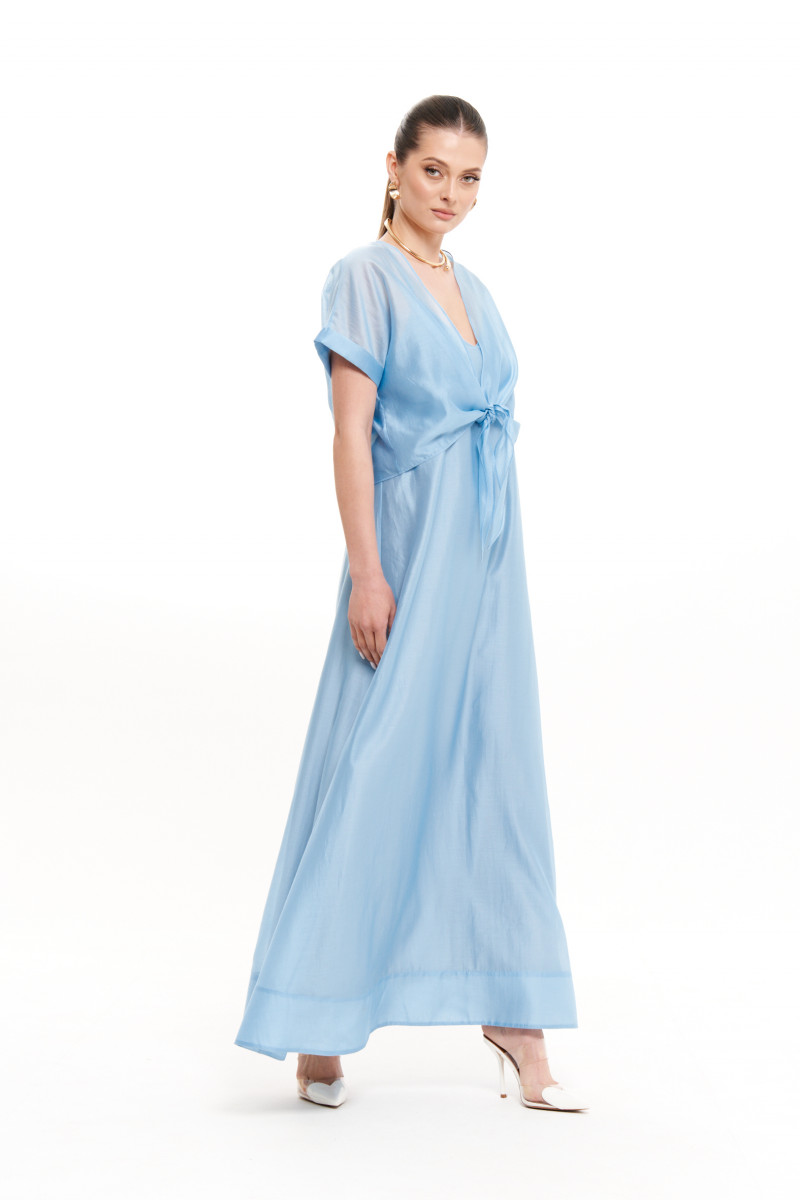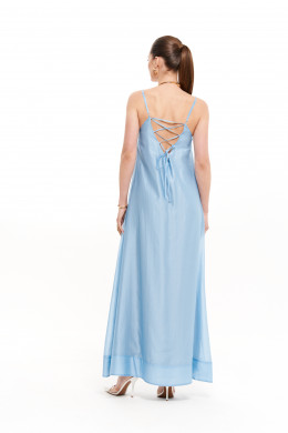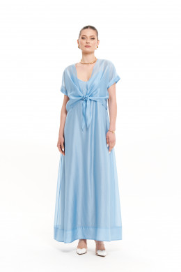 Платье женское из струящейся вискозной ткани для повседневной носки либо для торжественных случаев. Платье, расширенное к низу. Горловина по переду и по спинке V--образная. Спинка имеет вставленные петельки для шнуровки, за счет чего можно регулировать облегание по фигуре. Платье на регулирующихся бретелях. Длина изделия макси. Платье на вискозной подкладке. В дополнение к платью идёт блузка, которая прикрывает плечи и руки и делает образ гармоничным. Блузка прямая. Перед имеет по низу удлиненные завязки. Рукава цельнокроеные, низ рукава обработан отлетной манжетой. Стильное платье с блузкой в элегантном голубом цвете, который обязательно будет радовать вас своим великолепным видом. Данное платье будет отлично смотреться и скрывать видимые недостатки, но отлично будет подчеркивать все изящество вашей фигуры.