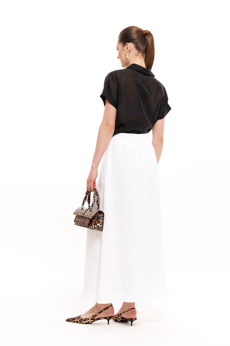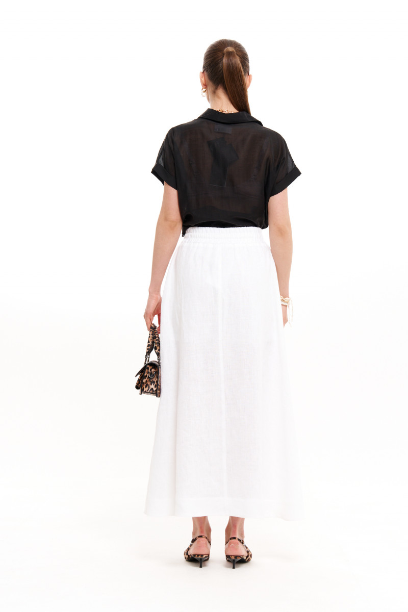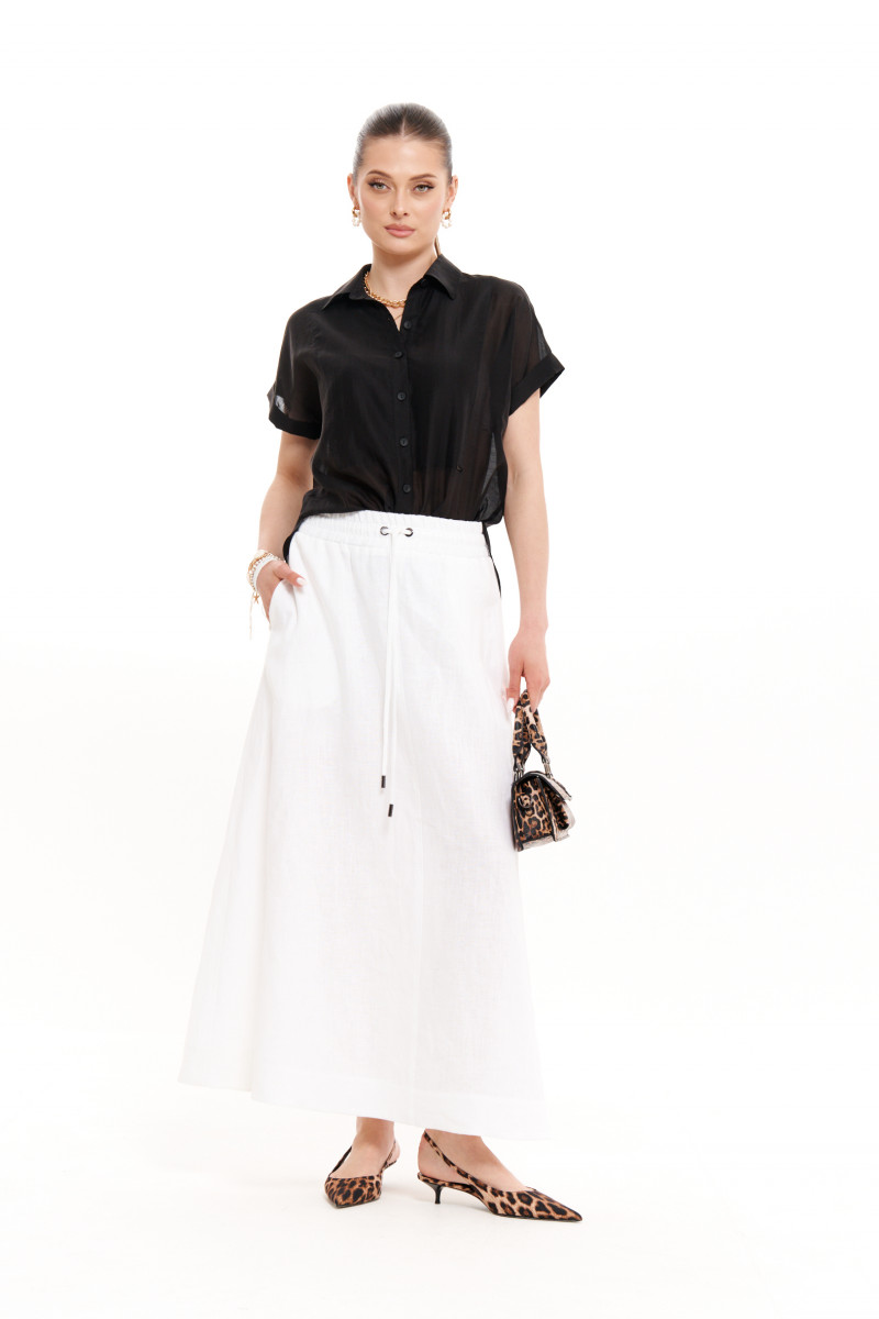 Юбка женская из хлопчатобумажной ткани для повседневной носки. Верхний срез юбки обработан притачным пояса со вставкой на резинке и вставленными завязками. Переднее полотнище юбки со средним швом. Заднее полотнище юбки имеет средний шов. В боковых швах имеются потайные карманы. Низ юбки обработан обтачкой. Юбка имеет хлопчатобумажную подкладку в виде шортиков. Юбка белого оттенка станет отличным вариантом для ваших прогулок, в ней вы будете чувствовать себя легко и очень нежно. Данная юбка будет отлично сидеть на любой фигуре за счет резинки в поясе, а ее стильный фасон будет радовать вас на протяжении всего дня.