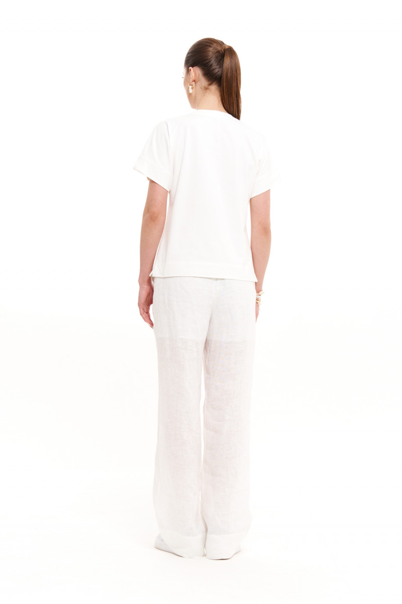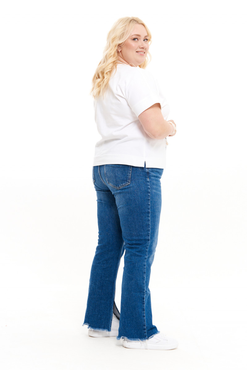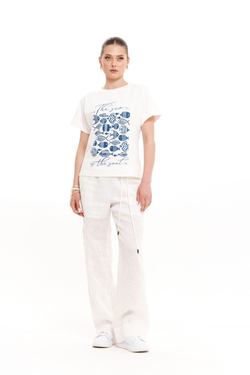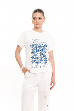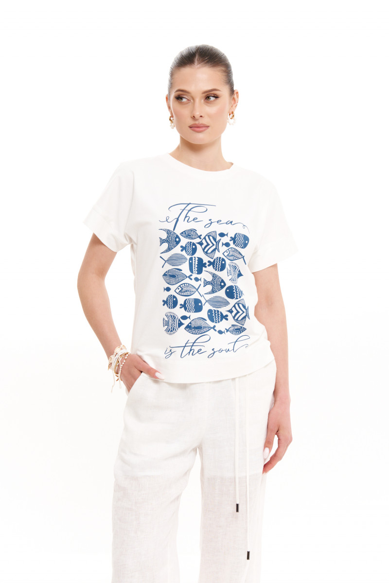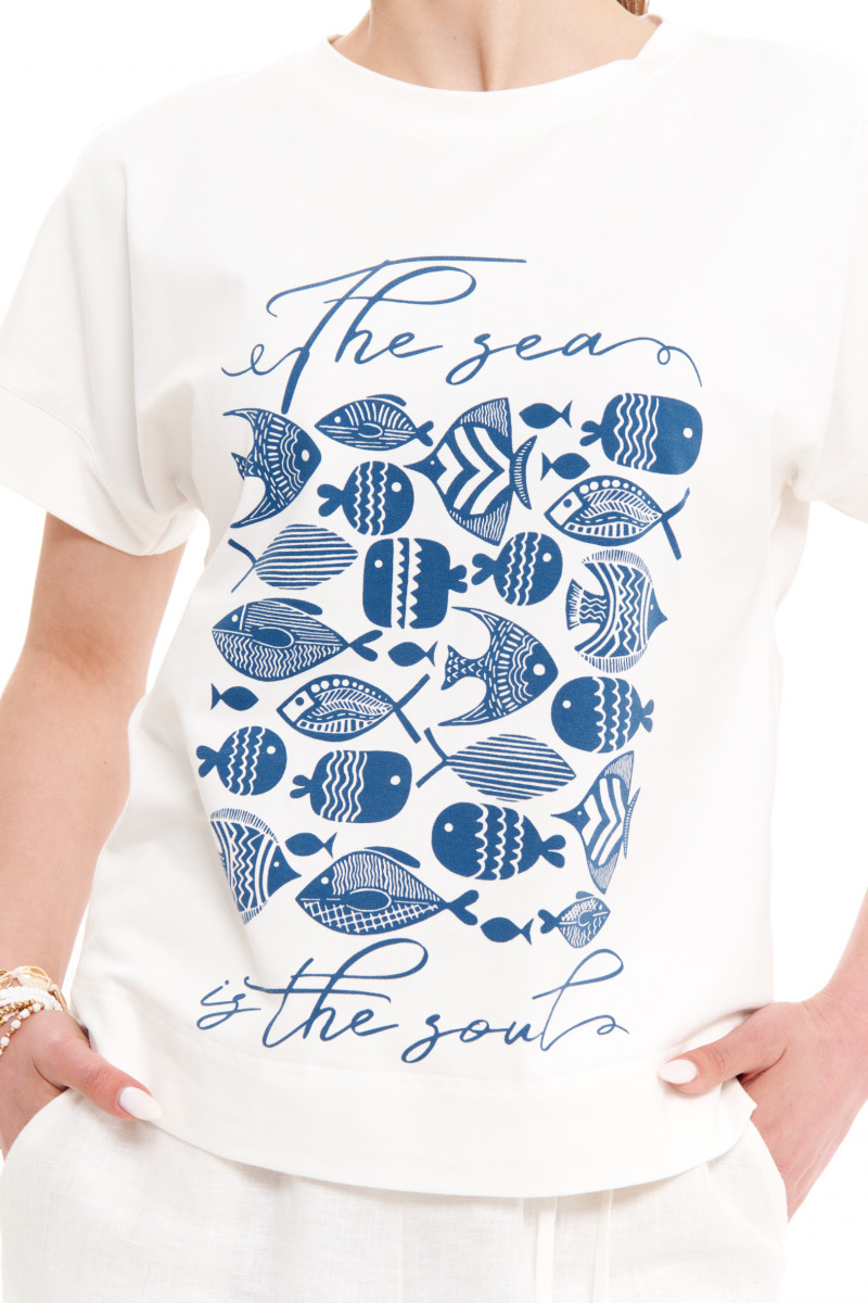 Джемпер женский из смесового трикотажного полотна с большим содержанием хлопка. Джемпер для повседневной носки прямого силуэта. Перед имеет дизайнерскую печать в виде очаровательных рыбок. В боковом шве имеются небольшие разрезы. Горловина чуть расширенная, обработана притачной тесьмой. Рукава цельнокроеные, длиной чуть ниже локтя. Легкий и очень практичный джемпер белого оттенка для вашего время провождения. В нем вы будете чувствовать легкость и комфорт в каждом движении. Данный джемпер будет отлично смотреться на любой фигуре.
