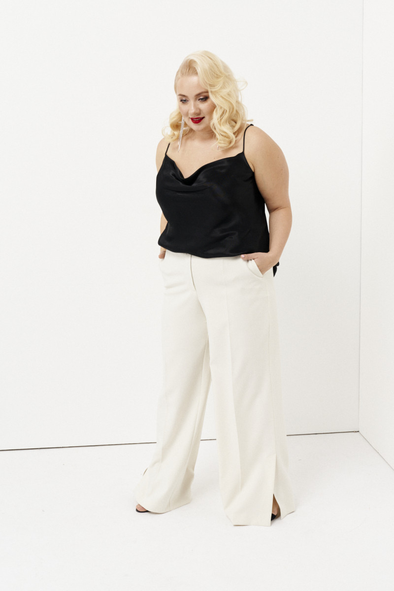 | 44 | Брюки: Высота посадки - 28см, Длина брюк без пояса - 109см, Длина по внутреннему шву - 84.5см, Ширина брючин сверху - 66.5см, Обхват брюк по низу - 54.5см, Ширина по бедрам - 48см, Ширина по талии - 35см; |