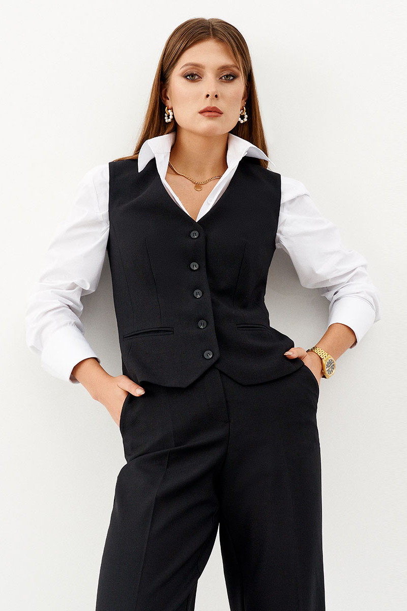 Жилет женский в классическом стиле бренда Ketty - современная база женского гардероба. Классический жилет выполнен из костюмной ткани с V-образным вырезом, полуприлегающего кроя, подходит для образов в офис, в университет, в школу, на каждый день. Жилетка короткая на пуговицах имеет подклад из вискозы, ее можно надевать под пиджак как первый слой (тренд сезона), под кардиган, а также сочетать с шелковыми топами, блузками женскими, водолазками, рубашками. Дополни жилеткой классическую прямую юбку, юбку мини, женские прямые брюки или брюки палаццо и даже джинсы!