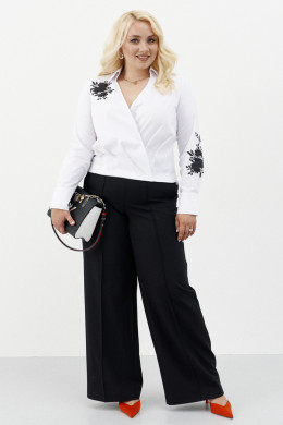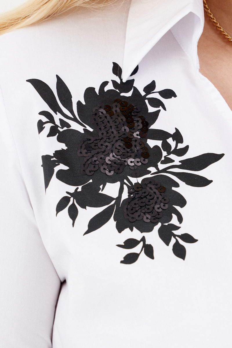 Блузка из хлопковой ткани как для повседневной носки так и для нарядных случаев. Изделие с запахом укороченное на потайной резинке. Блуза дополнена дизайнерской вышивкой, вышивка украшена пайетками. Дополнение: запах на кнопке, сбоку сделаны застроченные складки. Горловина обработана рубашечным воротником с отрезной стойкой. Рукава втачные длинные, низ рукава обработан притачной манжетой. Очень красивая и элегантная блузка, которая будет отлично сидеть на любой фигуре.