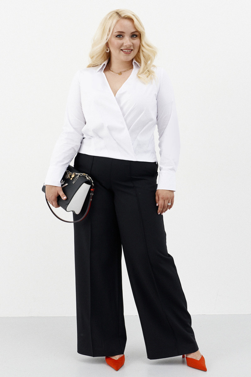 Блузка из хлопковой ткани как для повседневной носки так и для нарядных случаев. Изделие с запахом укороченное на потайной резинке. Дополнение: запах на кнопке, сбоку сделаны застроченные складки. Горловина обработана рубашечным воротником с отрезной стойкой. Рукава втачные длинные, низ рукава обработан притачной манжетой. Очень красивая и элегантная блузка, которая будет отлично сидеть на любой фигуре.