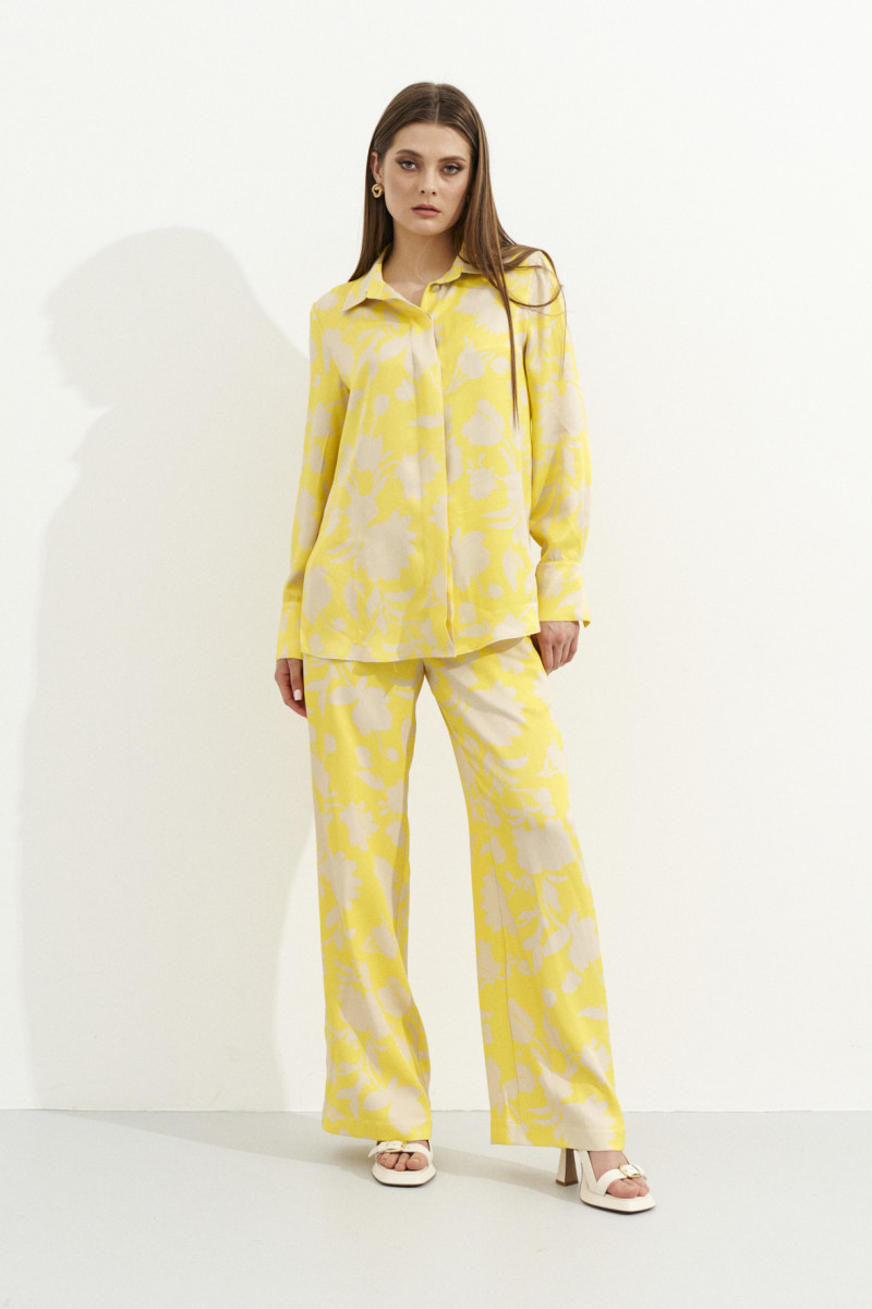 Хотите быть в центре внимания на любом мероприятии? Тогда наша свободная блузка рубашечного кроя - ваш незаменимый помощник в создании модного образа! Сочетание рисунка бежевых цветов на ярком желтом фоне и блестящей ткани из 100% вискозы - это нечто! Вы будете заметны среди толпы благодаря глубоким разрезам по бокам, которые можно завязать в модный узел. А сквозная застежка спереди на потайные пуговицы придает блузке особую изысканность. Эта модель идеально сочетается с широкими брюками из нашей коллекции, что делает ее неотъемлемой частью вашего гардероба. Не упустите шанс выглядеть модно и элегантно - наша свободная блузка с цветочным рисунком и блестящей тканью - тенденция лета 2023!