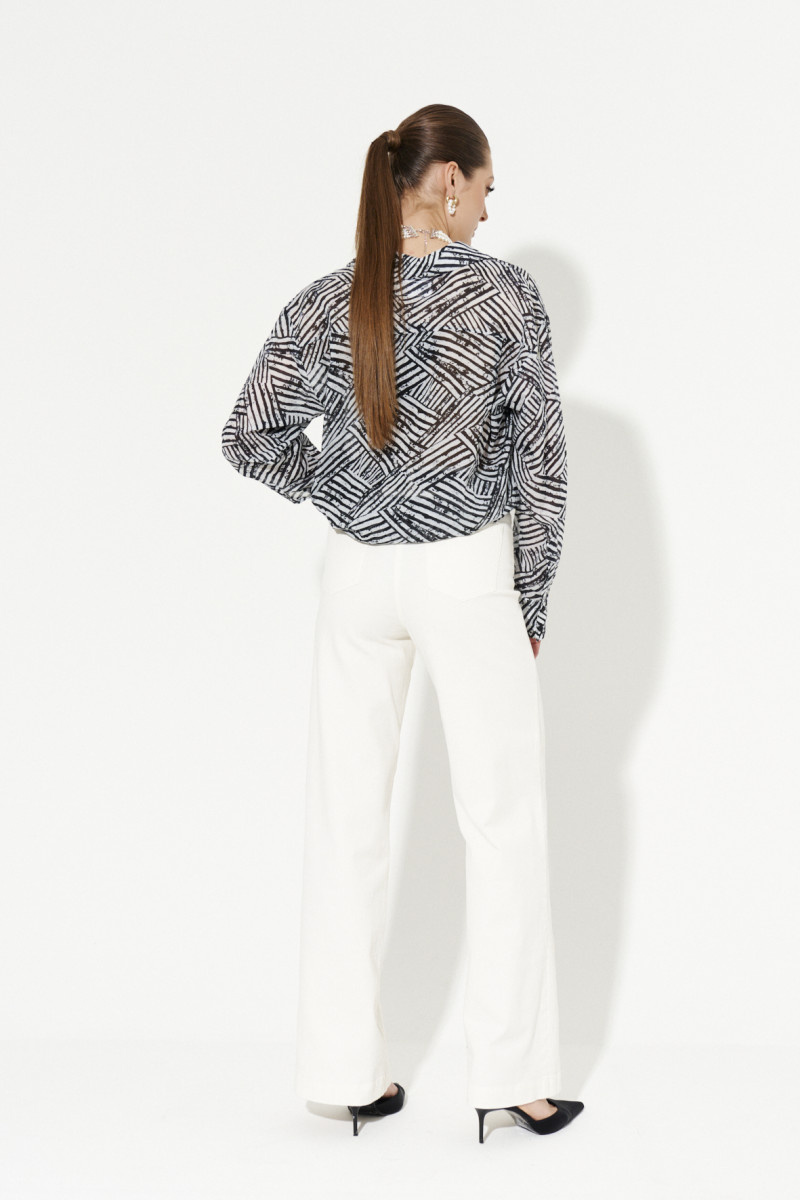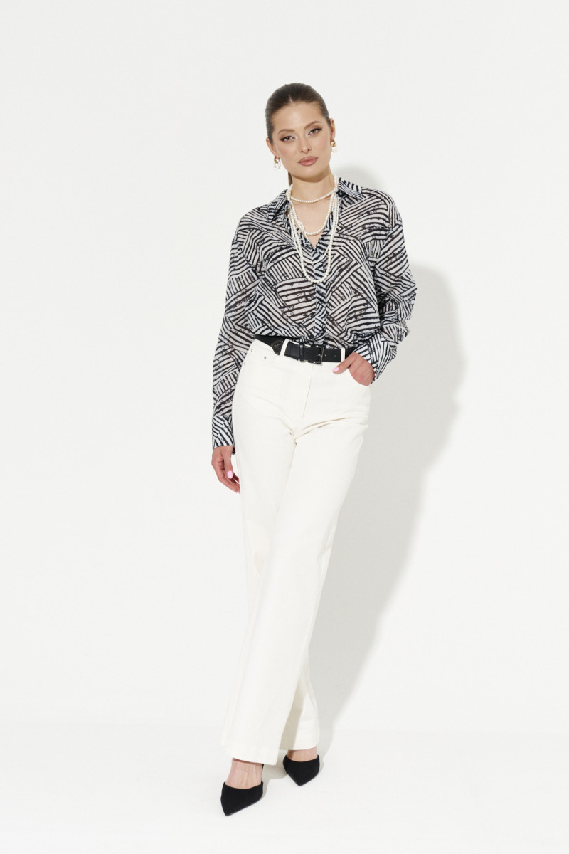 Брюки женские из джинсовой ткани с большим содержание хлопка. Брюки чуть расширены к низу. Верхний срез брюк обработан притачным поясом с застежкой на одну обметанную петлю и одну пуговицу, а также в среднем шве имеется застёжка-молния. Брюки имеют шлевки, что дает возможность носить их под ремень. Передняя часть брюк имеет два кармана с подкройным бочком. Задняя часть брюк имеет отрезную кокетку и два накладных кармана. Стильные и очень удобные брюки, которые безусловно будут отлично сидеть и подчеркивать всю красоту вашей фигуры.