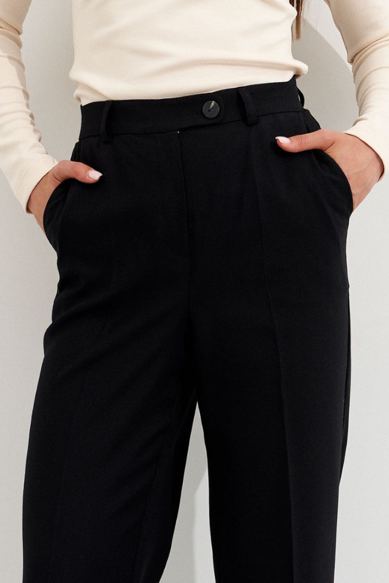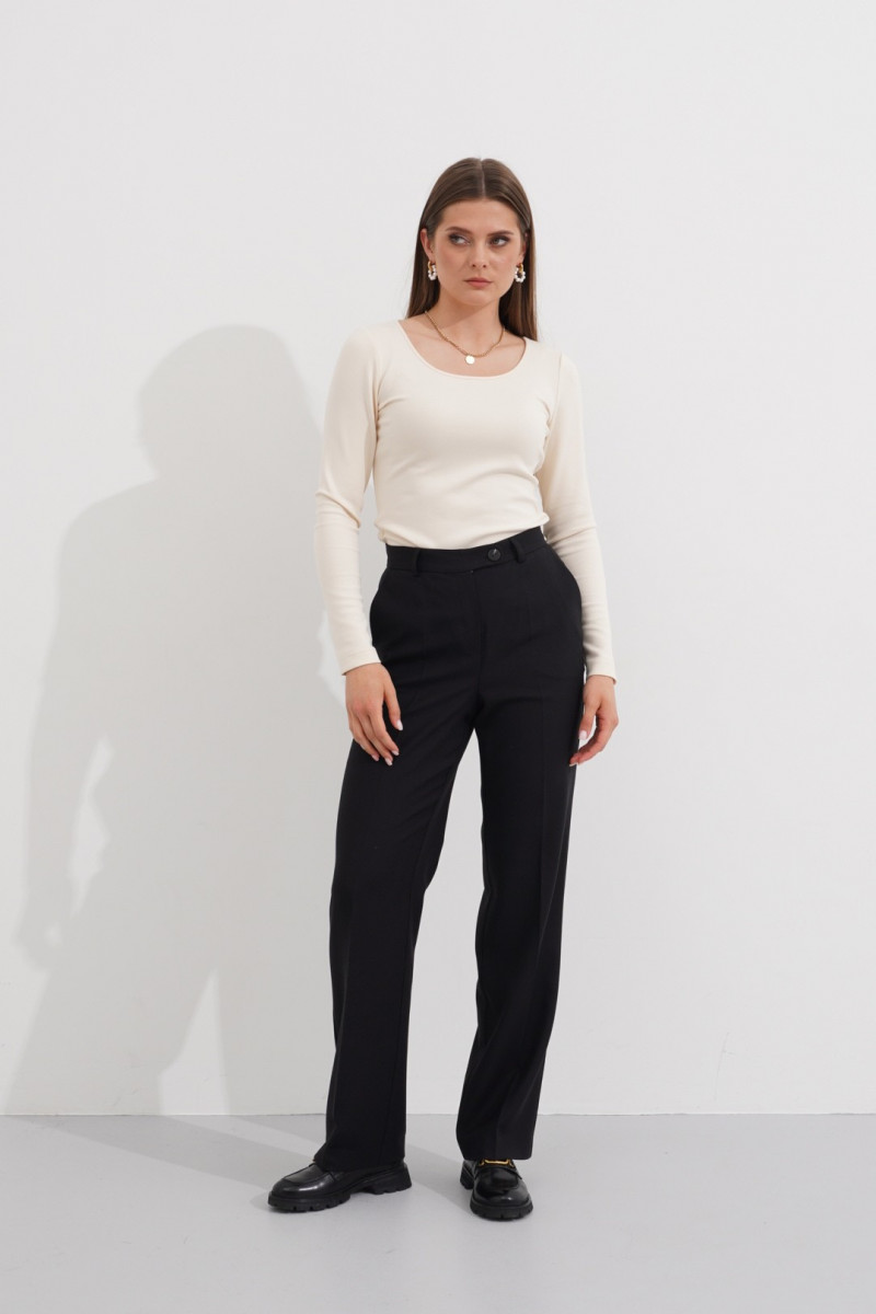 Брюки женские прямые из смесовой ткани для повседневной носки. Верхний срез брюк обработан притачным поесом. Застежка на одну обметанную петлю и одну пуговицу, а так же имеется застежка на тесьму-молнию в среднем шве брюк. Задняя часть брюк имеет две талиевые вытачки и прорезной карман в рамку с двумя обтачками. В брюках расположен в боком шве карман с подкройным бочком. Отличный классический вариант брюк, которые будут гармонично смотреться под любые изделия.