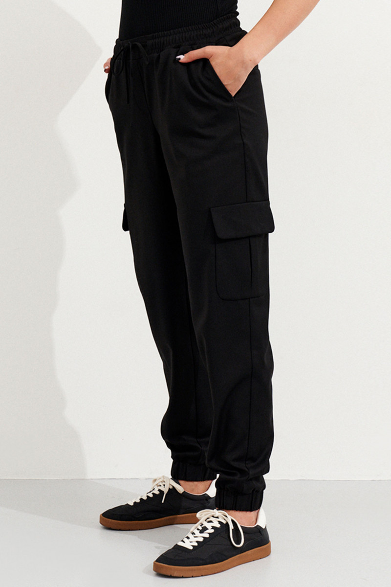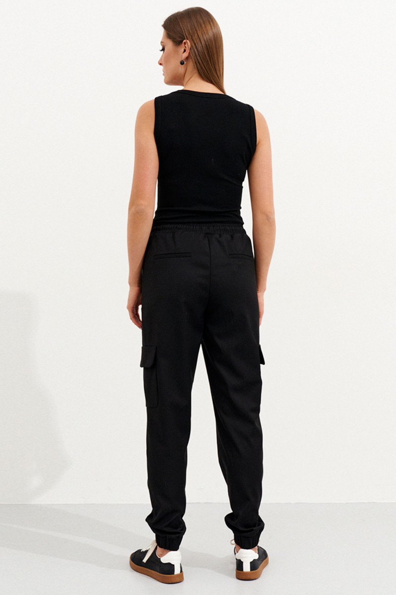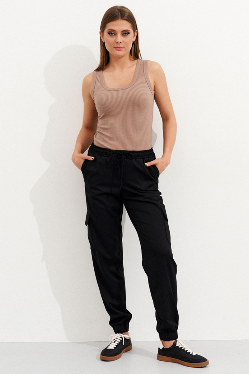 Брюки с поясом на резинке. По бокам выполнены накладные карманы с клапаном. По низу брючин – манжеты на резинке.