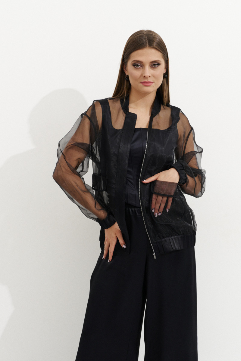 Жакет женский из органзы для повседневной носки прямого силуэта. Застежка доверху на молнию. Низ изделия обработан притачным поясом на резинке. Горловина обработана воротником стойкой. Рукава втачные, низ рукава обработан притачной манжетой на резинке. Стильный и красивый вариант жакета, а главное очень легкий и удобный. Данная модель подойдет для любого рода прогулок.