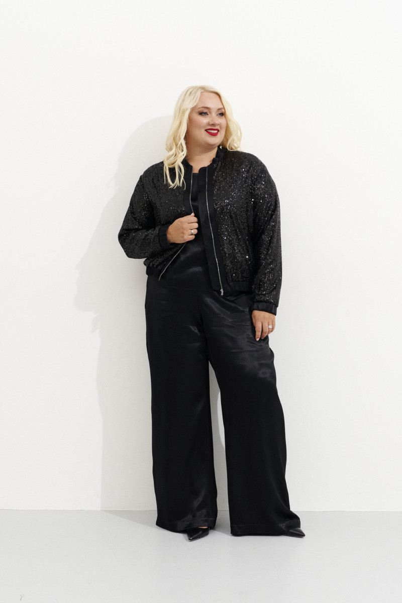 Жакет женский из нарядной ткани в пайетки. Жакет с длинным втачным рукавом. По низу рукава манжета на резинке. По переду имеются прорезные карманы в рамку. Горловина обработана стойкой. Застежка на молнию, вдоль которой отделочные планки. По низу жакета притачной пояс с резинкой. Планки вдоль молнии, манжеты, пояс по низу изделия оформлены деталями из атласной ткани. Жакет на вискозной подкладке. В этом нарядном жакете вы будете неотразимы!